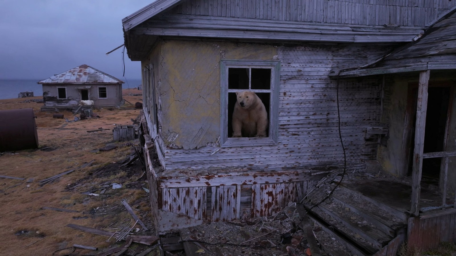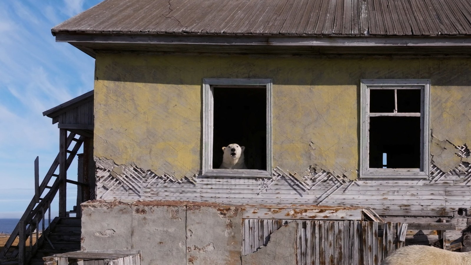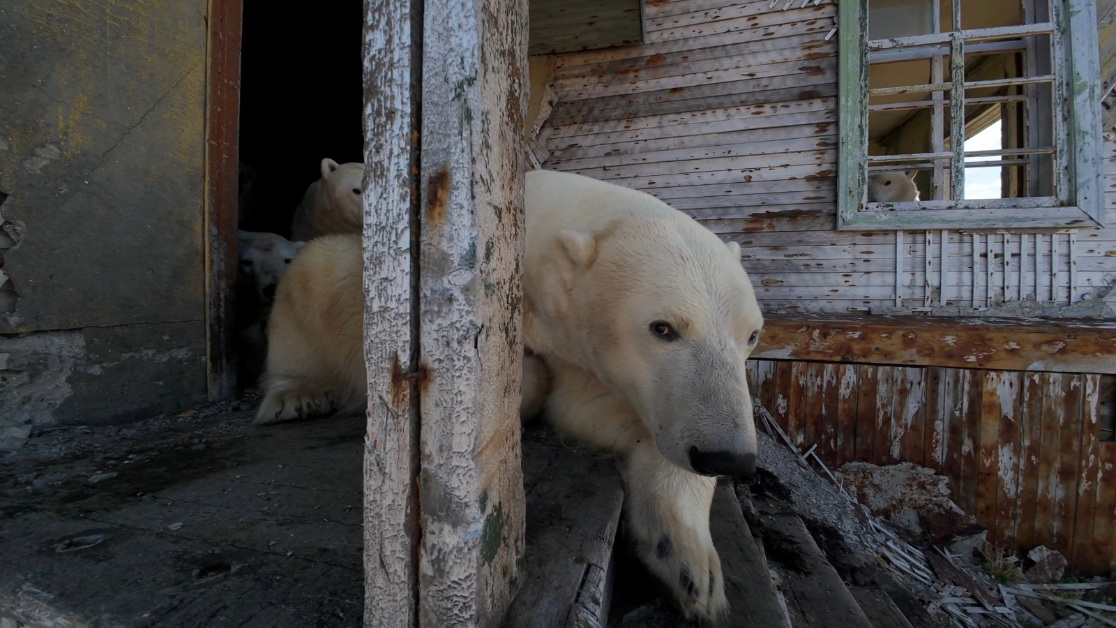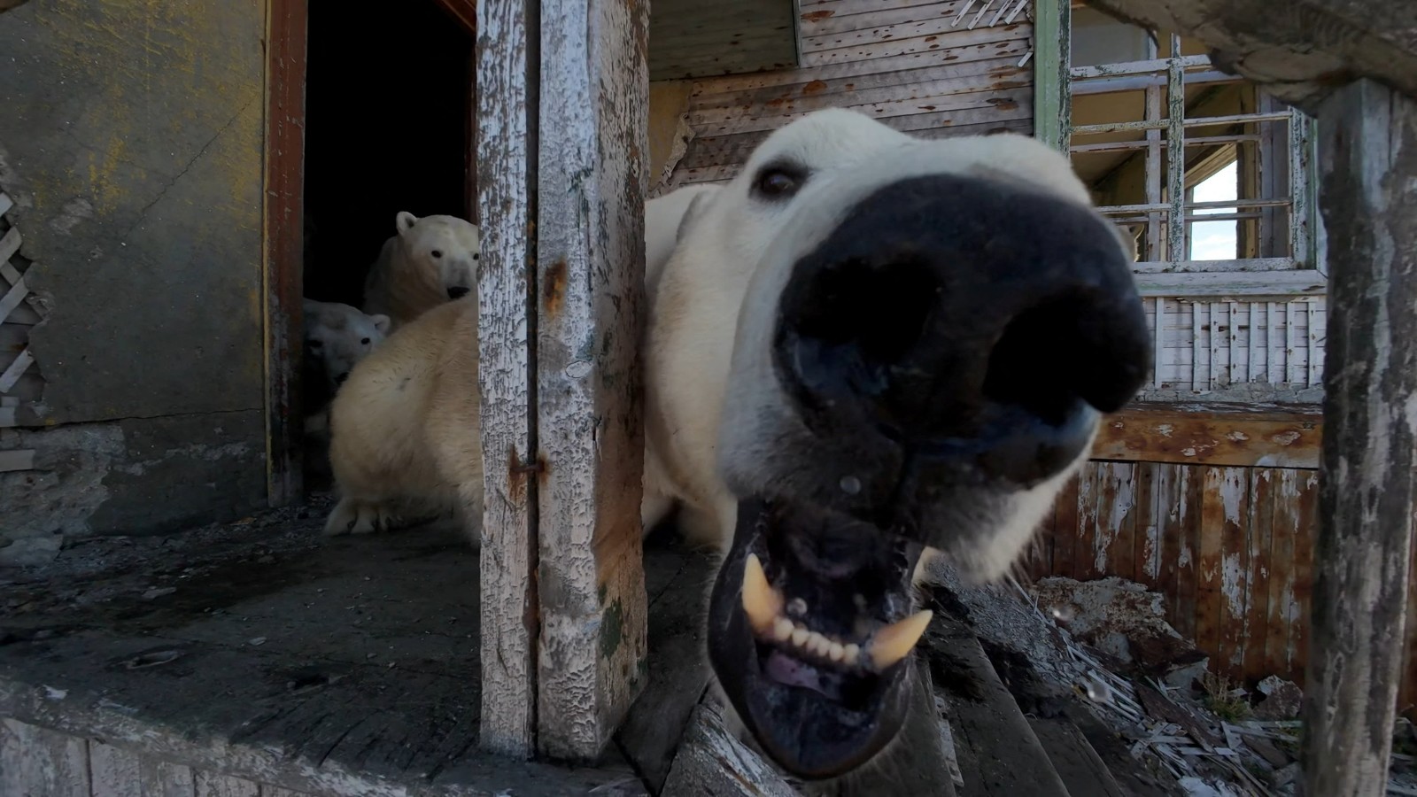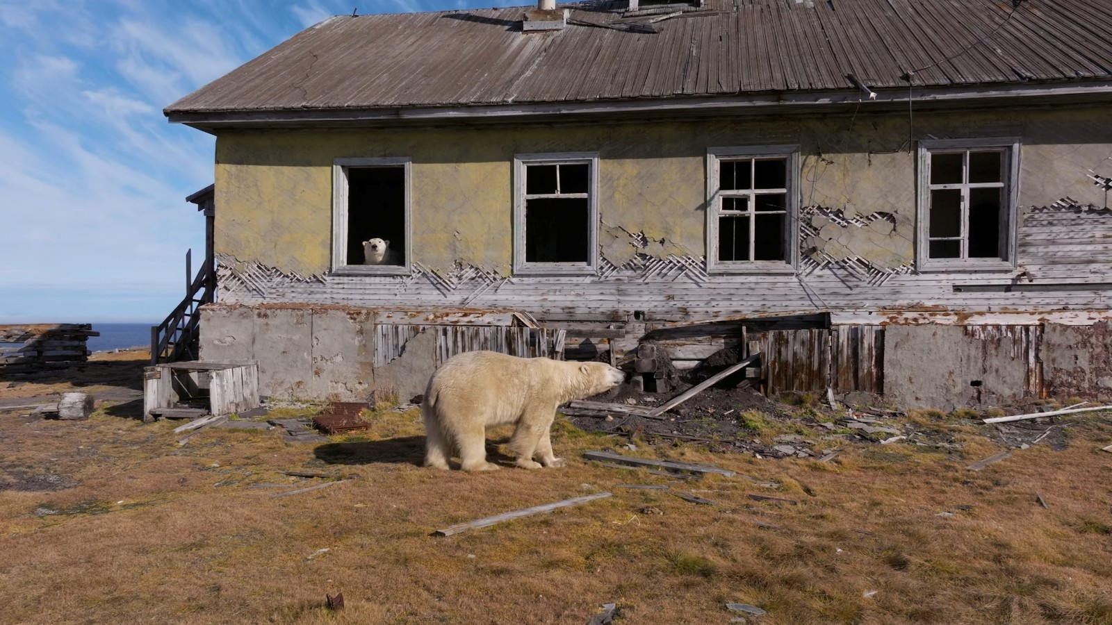 30多年前蘇聯解體後不久,蘇聯科學家便離開這座研究站,附近的村落也遭遺棄,畫面可見這些熊從各門口進出、從窗子探出頭來張望,或在研究站草地上懶懶曬太陽,還有湊近無人機鏡頭一探究竟,或舉起一掌像在「哈囉」,其實想要觸摸或擊打無人機。