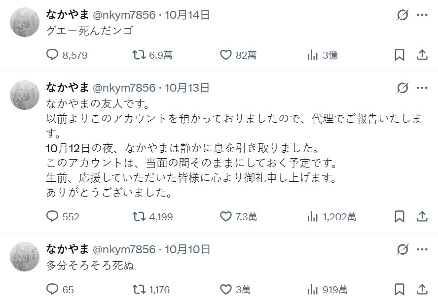 沒想到就在眾人弔念之時,其帳號14日又發文,是男大生常用的迷因語氣說「哇喔~我死掉了(グエー死んだンゴ)」,讓大家嚇一跳,網友推測,這是男大生想向世界溫柔道別,逝世前預先排程貼文。