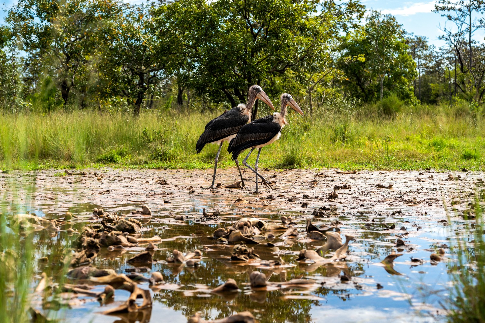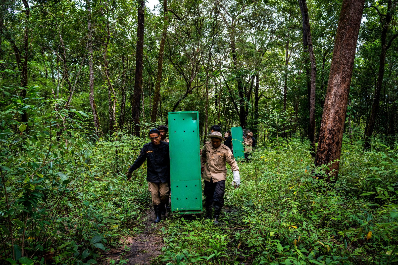 這2隻是柬埔寨首度成功人工繁殖大禿鸛,11月下旬牠們約9個月大時,於暹邦野生動物保護區(Siem Pang Wildlife Sanctuary)野放,保護區目前由柬埔寨保育組織「鳳凰飛翔」(Rising Phoenix)管理。