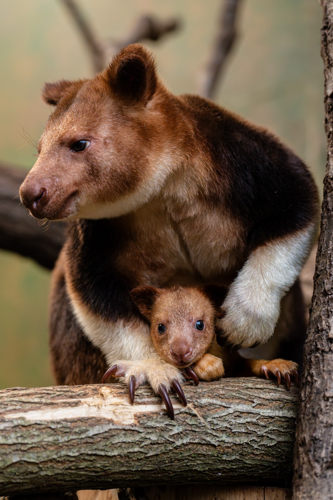 英國切斯特動物園上月宣布,園中「古氏樹袋鼠」幼崽從媽媽育兒袋露臉,牠剛出生時只有一顆雷根糖大小,在育兒袋待了數月才探出頭來。有著「泰迪熊的臉」的樹袋鼠因行蹤隱蔽、爬樹極快,又有「森林鬼魅」稱號,在樹枝間橫向跳躍距離可達9公尺,而縱向更是可從18公尺(約6層樓)高處一躍落地,安然無恙。