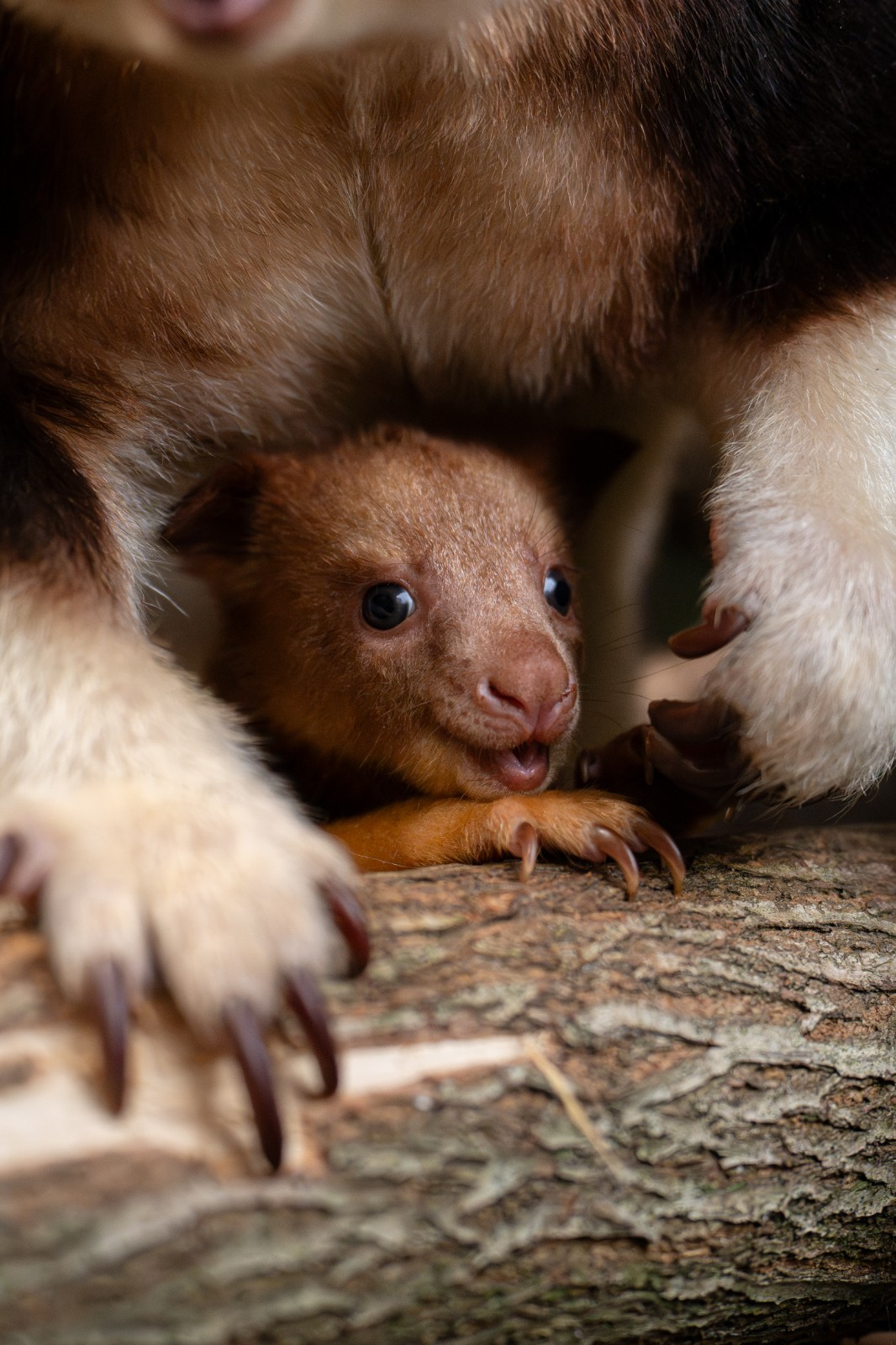 英國切斯特動物園(Chester Zoo)1月宣布,園中的古氏樹袋鼠(Goodfellow’s tree kangaroo)幼崽,剛從媽媽的袋中冒出頭來,這個小男生出生時只有一顆雷根糖( jellybean)大小,體重2克到3克,拍照這會兒已經1.85公斤了,現在已經會搶媽媽手中食物,幼崽通常會賴在育兒袋中7個月左右才完全離開。