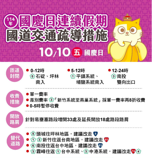 今日國慶焰火施放地點因鄰近國3南投交流道,高公局籲請前往觀賞焰火之用路人,事先至「2025國慶焰火在南投」官方網站查詢交通資訊,預為規劃交通方式及動線,並建議多利用公共運輸。