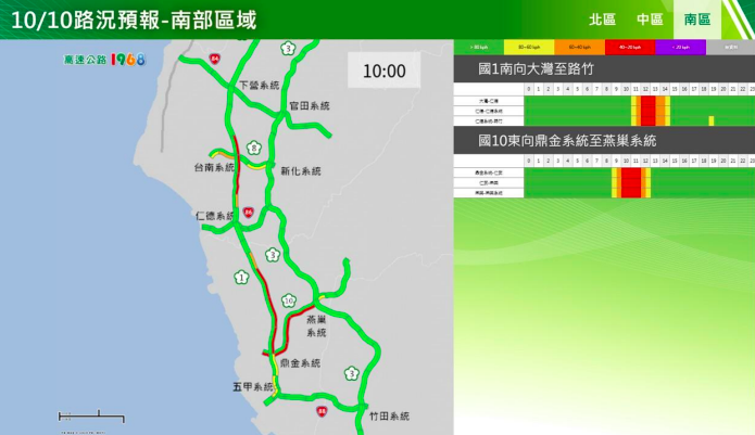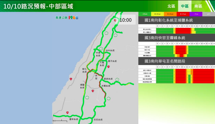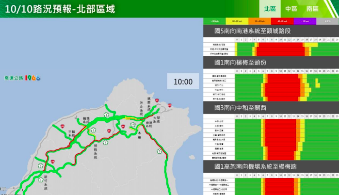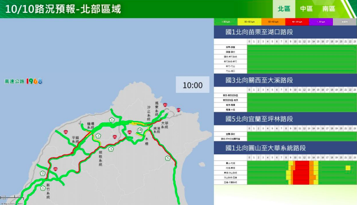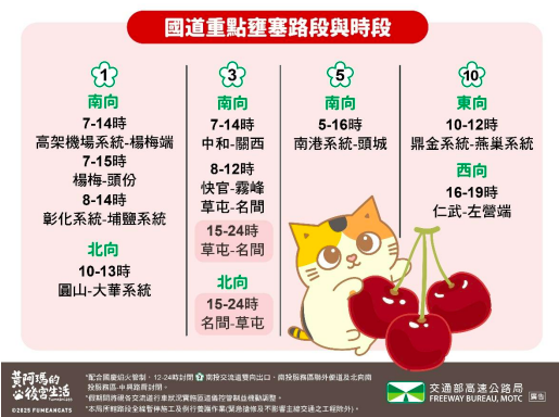 高公局預判,今日上午重點壅塞路段為國1南向高架機場系統-楊梅端、楊梅-頭份、彰化系統-埔鹽系統,北向圓山-大華系統;國3南向中和-關西、快官-霧峰、草屯-名間;國5南向南港系統-頭城;國10東向鼎金系統-燕巢系統等路段。高公局建議,西部國道南向用路人儘量於12時後出發,國5南向用路人建議17時後出發。