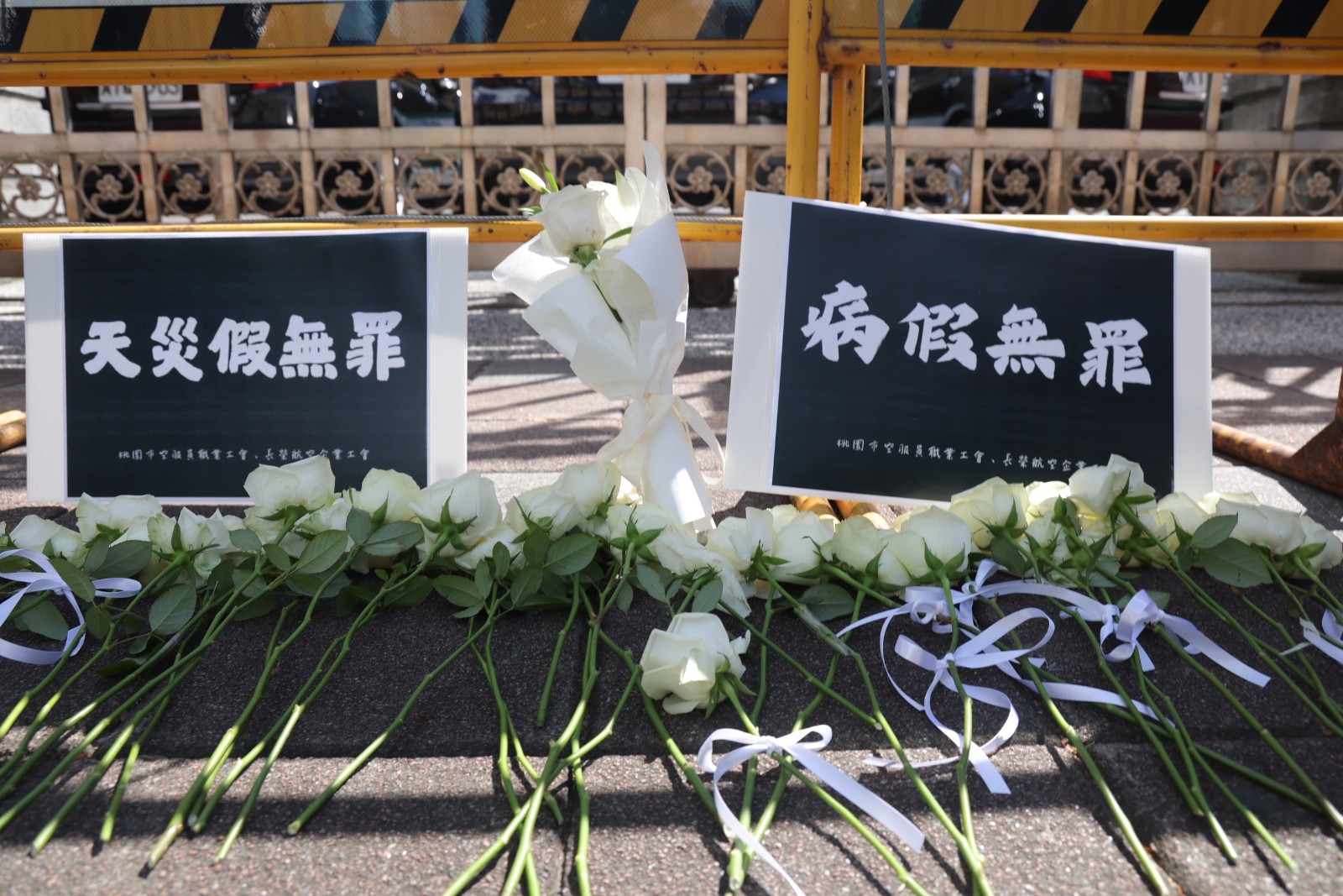 曲佳雲指控,有人想要把公司內對孫姓空服員的弔唁區移除,因此15日上午工會將弔唁區的白色玫瑰花,轉移到立法院外,不只為空服員請命,也為全台勞工發聲,訴求立法院修法,禁止雇主因員工請病假而有不利待遇。