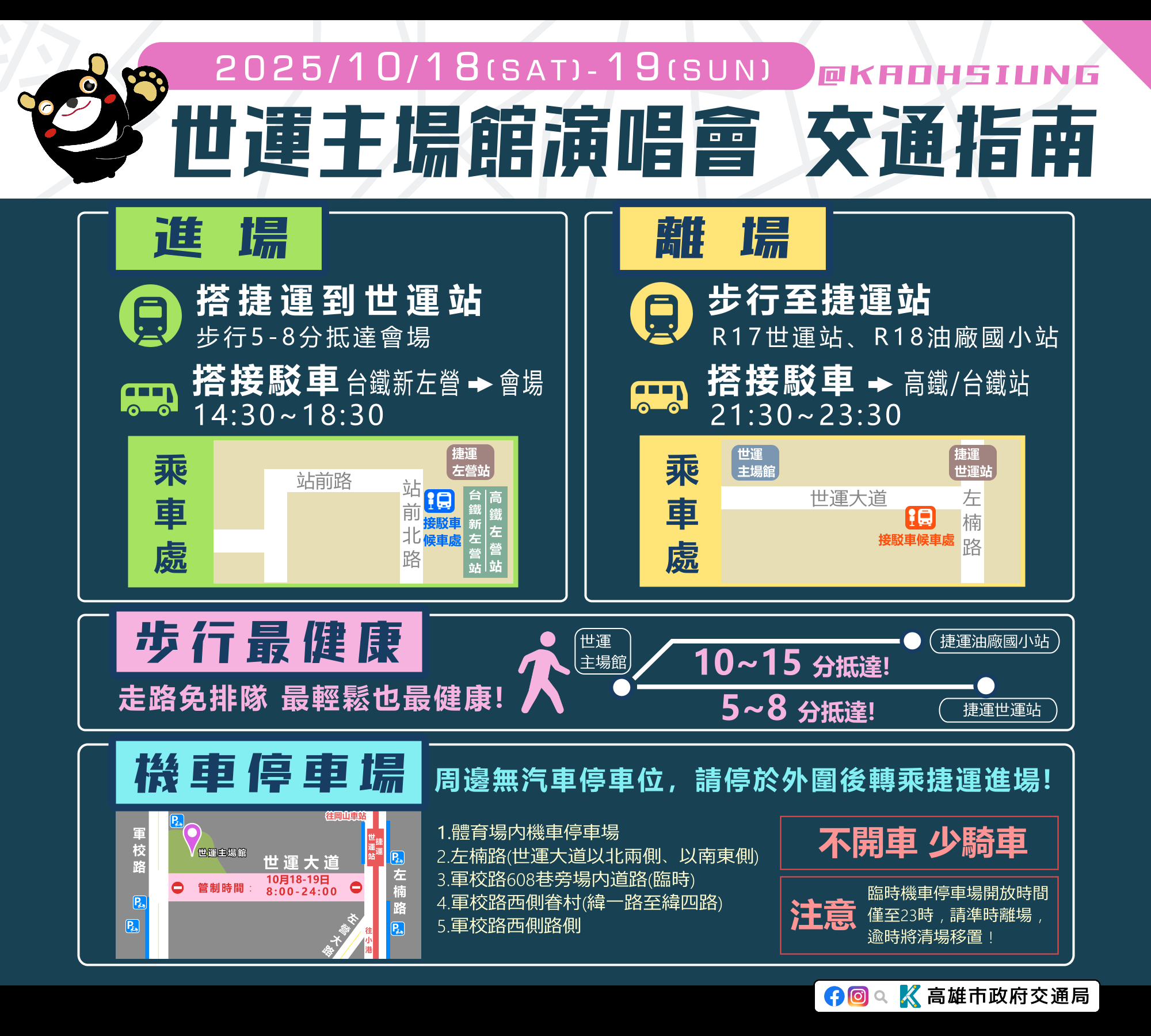 此外,搭捷運至紅線 R17 世運站出站,步行 5~8 分鐘即可抵達世運主場館。另外散場部分,捷運公司已規劃提高捷運疏運量能,縮短班距為3~5分鐘,維持散場動線順暢;另演場會場將安排免費接駁專車,14時30分至18時30分提供「高鐵左營站/台鐵新左營站-演唱會場」進場接駁車服務、21時30分至23時30分提供「演唱會場-高鐵左營站/台鐵新左營站」散場接駁車服務。