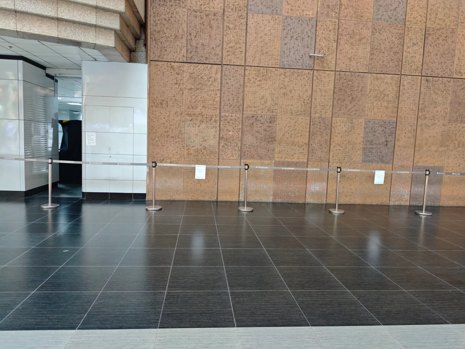台北車站大廳拉起近一整排、約數十公尺的紅龍柱,並張貼公告標示「禁止躺臥、飲酒、抽菸等行為」。X@catcatzero授權提供