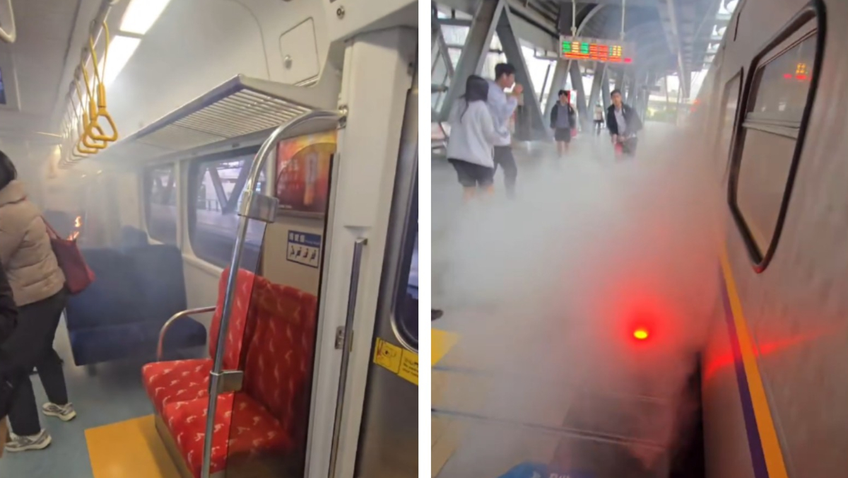 台鐵2122次區間車旅客行動電源自燃,造成車廂內煙霧瀰漫,乘客緊急疏散。翻攝Threads@tw.tra.train.flight.pig