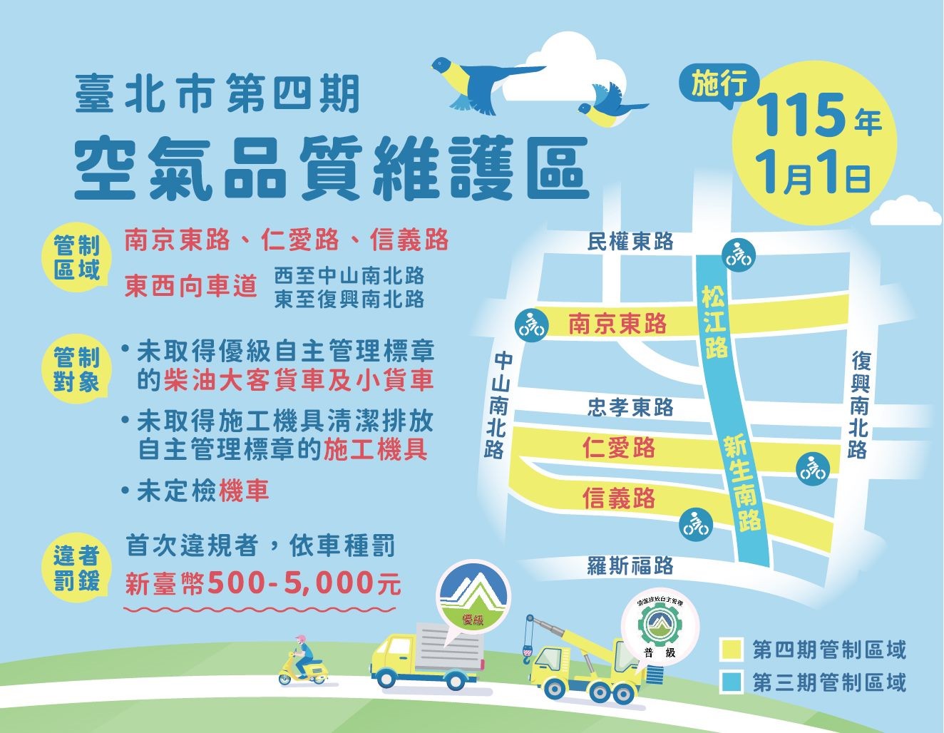 台北市政府表示,為提升空氣品質並維護市民健康,自今年(2026)1月1日起,在「第四期空品維護區」加強管制高污染車輛,先對違規車主寄送勸導單,自7月1日起直接取締告發,可處500元至6萬元罰鍰。