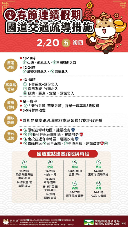 今(20日)是大年初四,春節正式進入倒數計時,各地車流湧現,交通部高速公路局預估,今日交通量為134百萬車公里,比昨日(2/19)131.2百萬明顯增多。高公局亦提醒,今日上午有4處雍塞路段,提醒民眾上路前應了解並配合全段疏導措施,以利行車安全與行程安排。