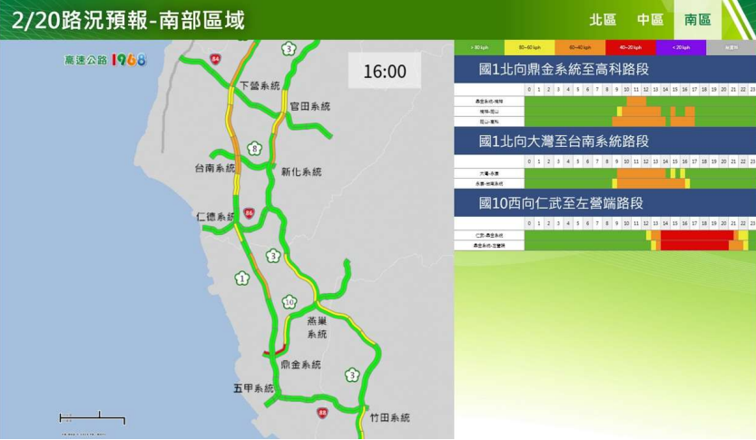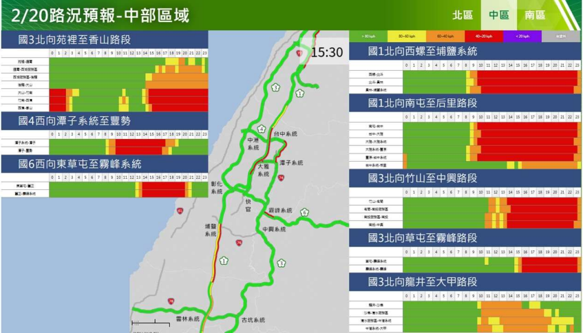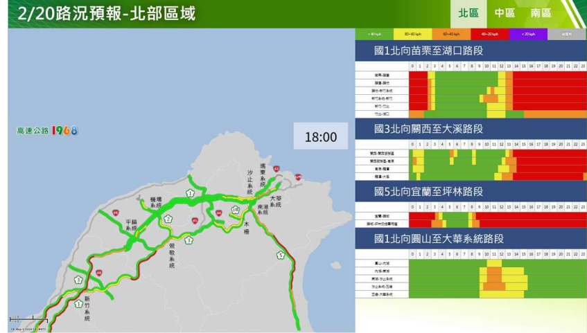 高公局預估2/20初四國道車流達134百萬公里,西部北、中、南的車潮雍塞時段出爐。高公局提供
