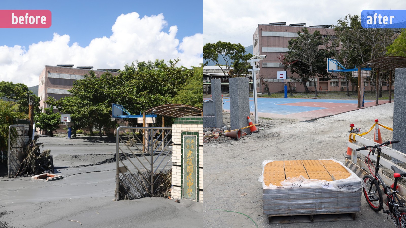 光復國中的校門口當時被淹了一半,寸步難行,這次回去泥砂被清乾淨了,門口一整排正在做重建工程,一旁的操場草皮光禿禿的,路面上還有石塊等廢棄物,但誰也無法阻擋學生們愛打棒球的心,下課10分鐘跑出來玩接球,很開心。