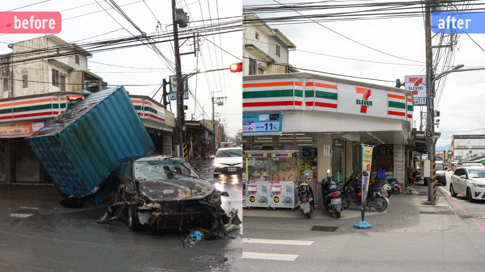 便利超商的招牌,原本被貨櫃與車輛慘烈撞擊,如今已經恢復原狀了,中午時分,顧客分批湧入,服務能量滿載。