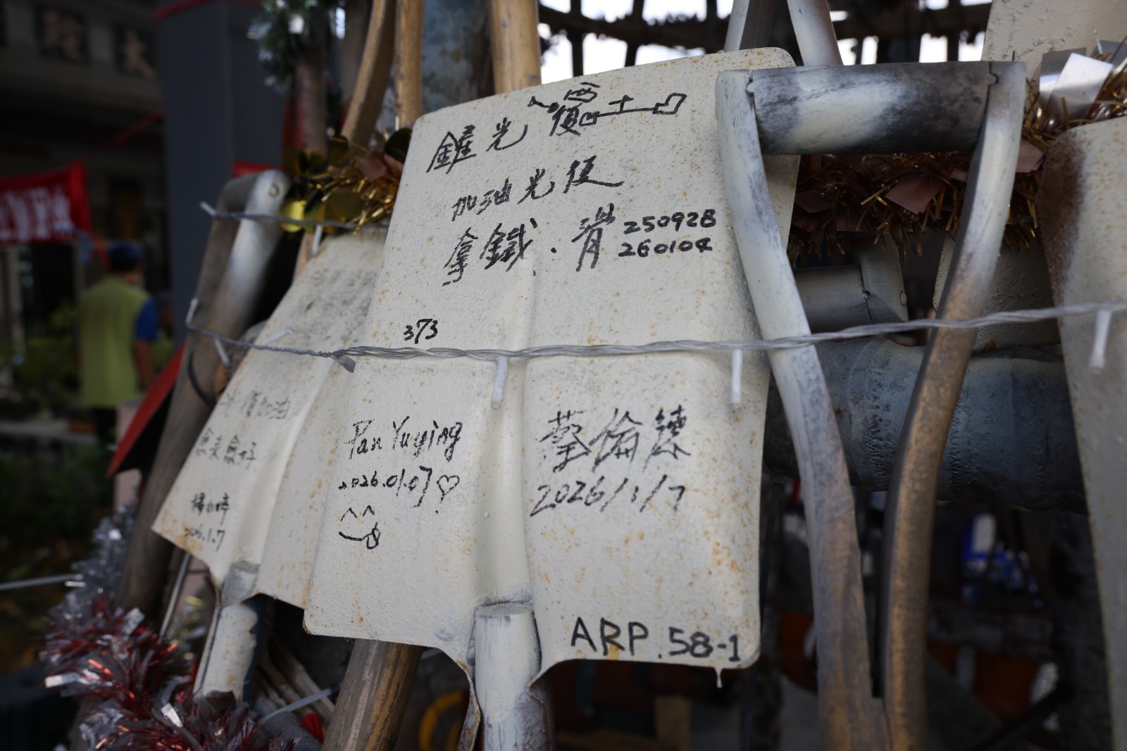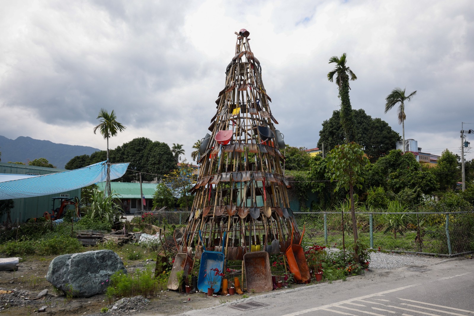 鏟子超人留下來的鏟子、雨鞋、手套等工具成最另類、具有意義的聖誕樹。廖瑞祥攝
