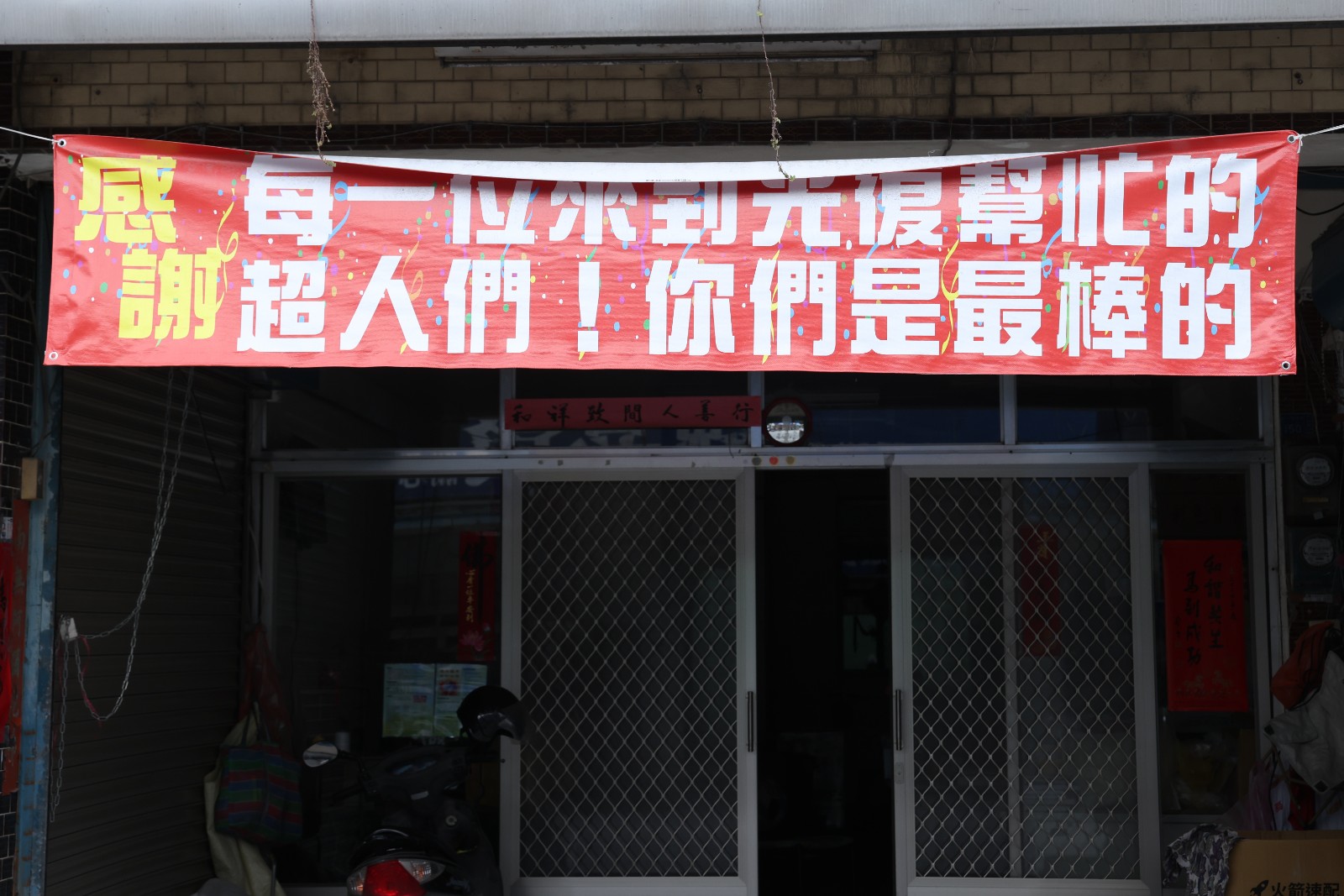民眾藉紅布條向所有救災超人們表達感謝。廖瑞祥攝