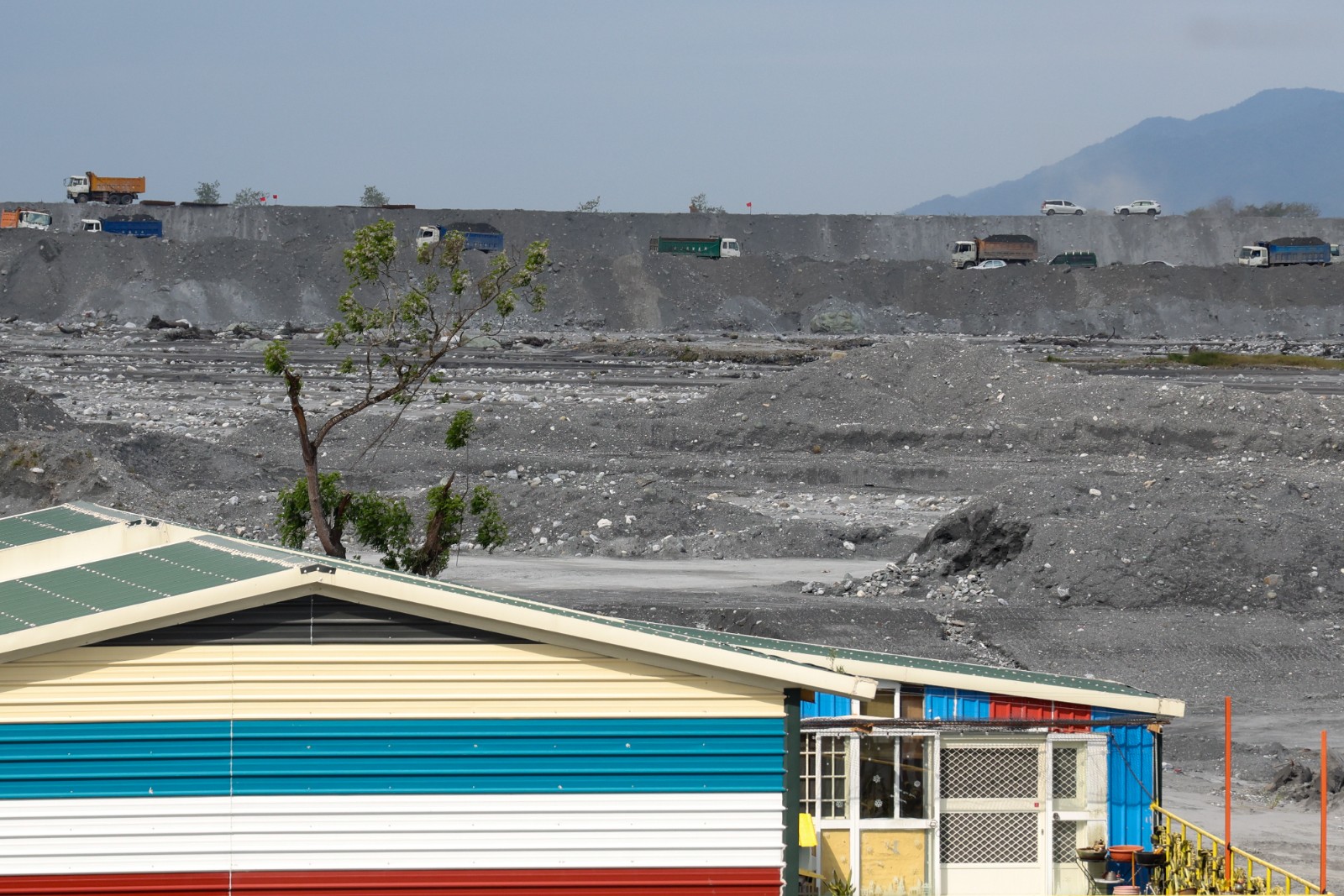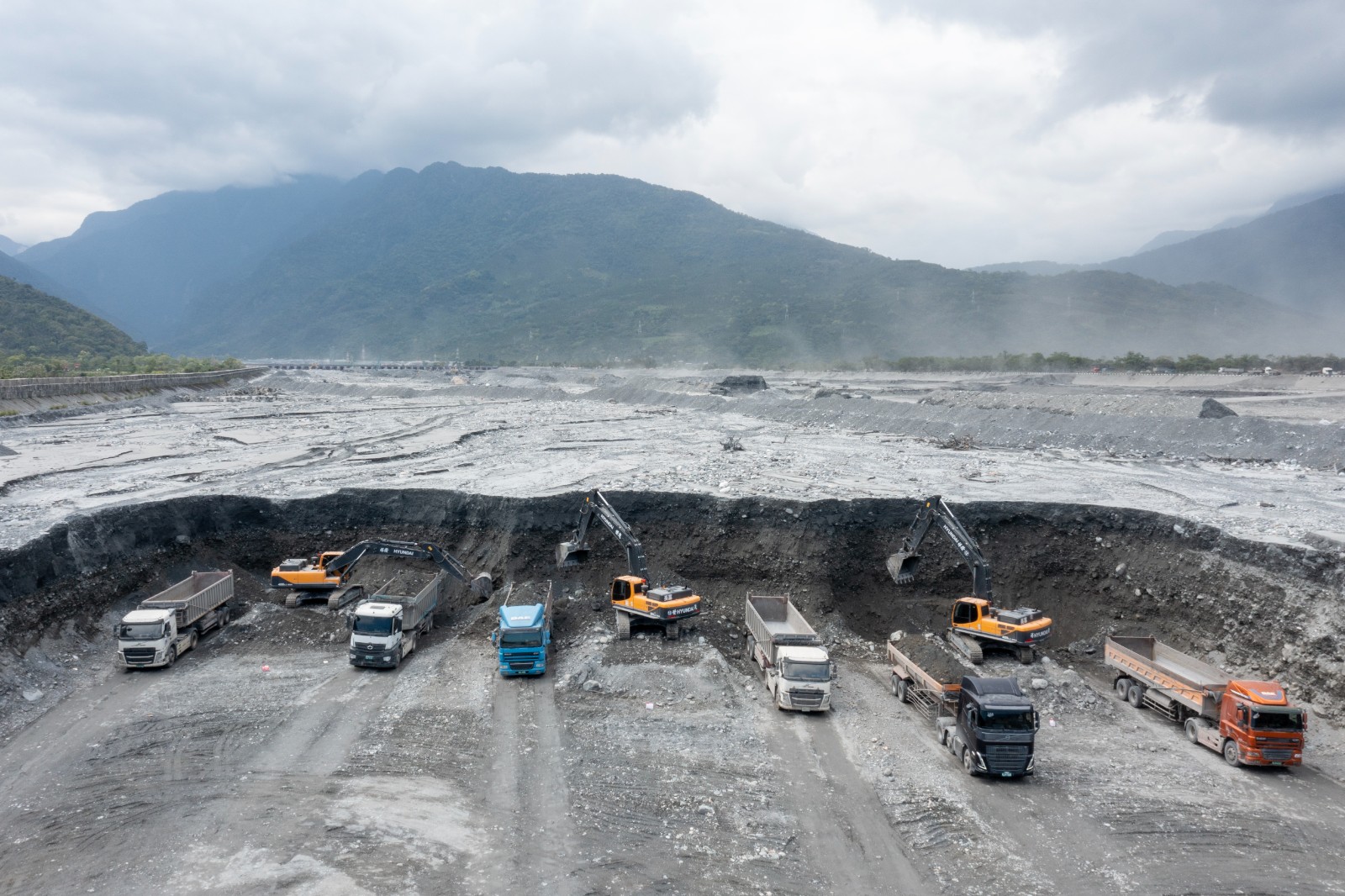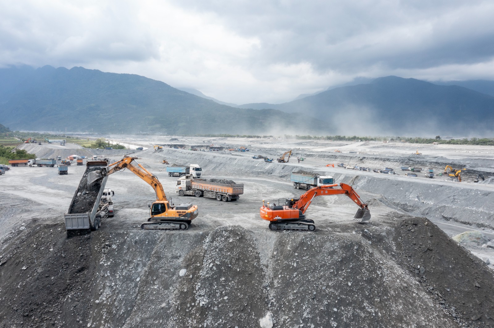 2026年3月17日,馬太鞍溪河床、堤防整治工程,數百名重機具與工程人員與高聳的淤泥奮鬥著。廖瑞祥攝