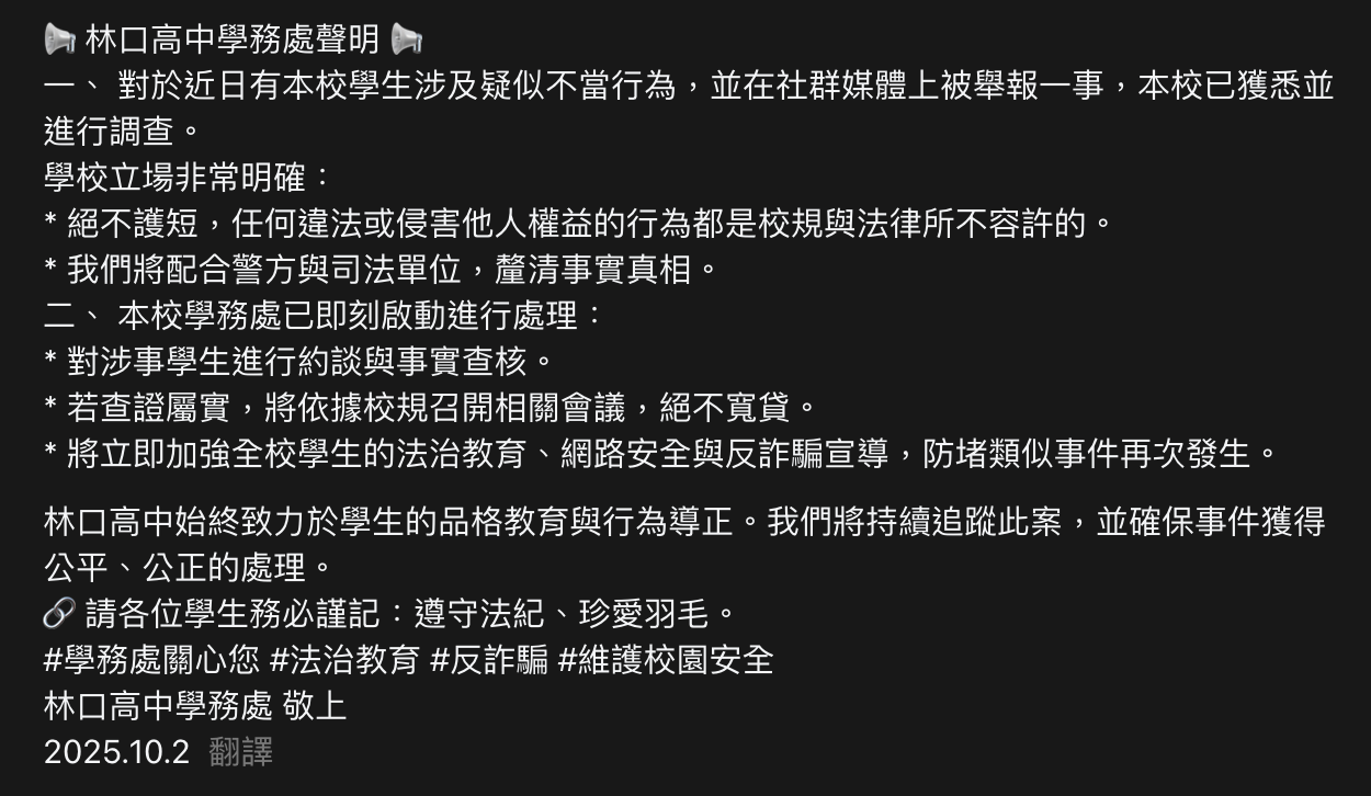 事件發生後,更是有人直接向林口高中檢舉,對此學校也於昨(2)日進行回應,表示該校將進行調查,並強調校方的立場明確,絕不護短,任何違法或侵害他人權益的行為都是校規與法律所不容許的,也將配合警方與司法單位,釐清事實真相。