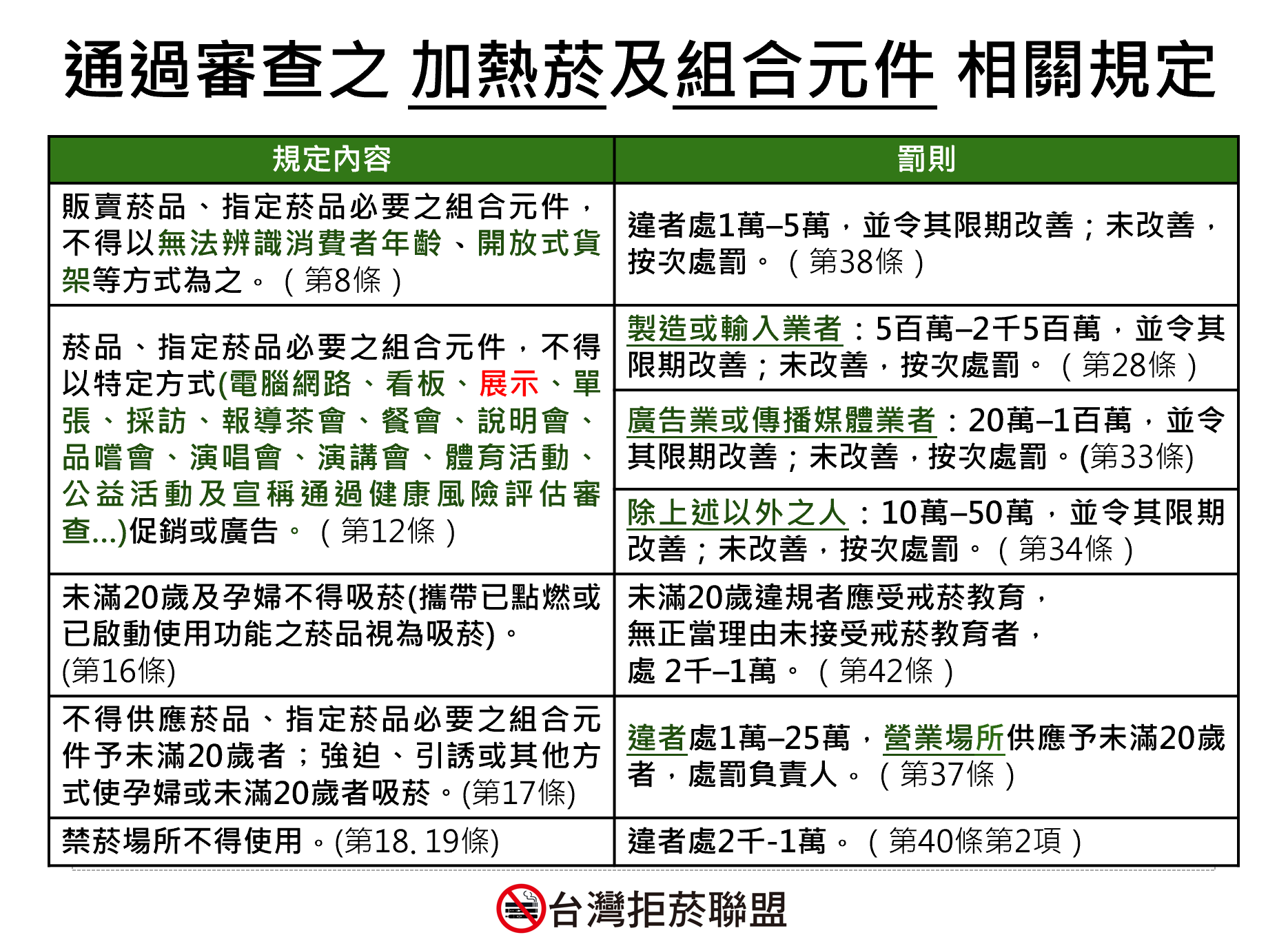 台灣拒菸聯盟指出,《菸害防制法》第1條開宗明義規定「為防制菸害,維護國人健康,特制定本法」,依法應作為菸害防制之特別法,優先於其他法規適用,政府應依法行政,禁止任何形式的菸品或加熱菸載具的廣告或促銷。同時《中央法規標準法》第16條內文提到,法規對其他法規所規定之同一事項而為特別之規定者,應優先適用之。