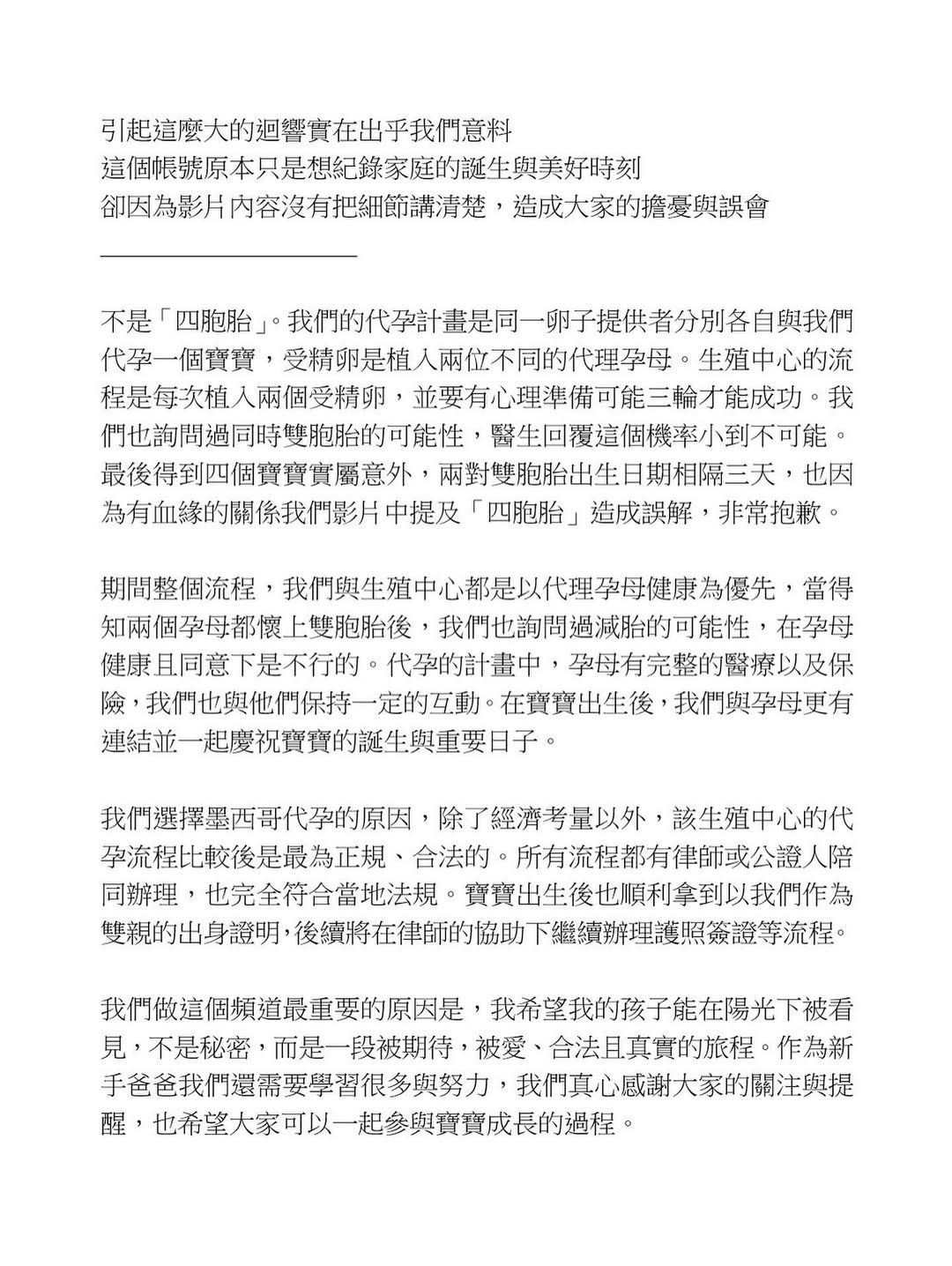 面對爭議持續擴大,「壹零出4啦」發布聲明澄清,「不是4胞胎,而是兩位代理孕母各自懷上雙胞胎」,他們強調因孩子間有血緣,因此影片稱4胞胎,未提前交代清楚才引發誤會。他們說,選在墨西哥代孕的是「流程合法、醫療完整」的生殖中心,所有手續均有律師或公證人陪同辦理;孕母具備完整醫療與保險,雙方保持適當互動、均確認自願參與;2對雙胞胎新生兒實際出生時間相差3天,而非同日早產。