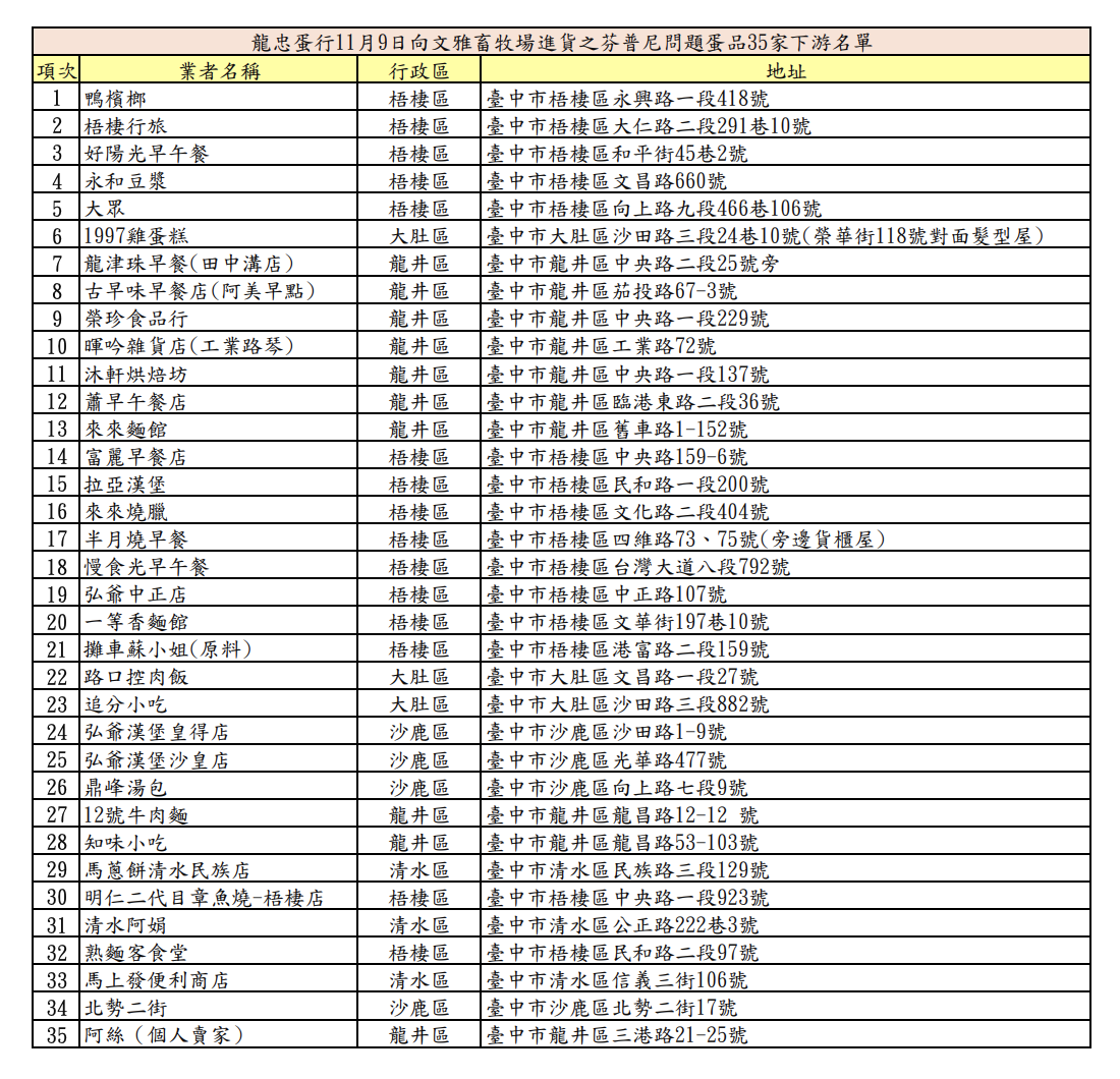 台中市衛生局公布龍忠蛋行售出文雅畜牧場雞蛋的35家業者名單如下: