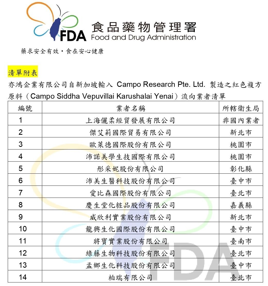 「亦鴻企業」自新加坡進口紅色複方原料流向業者名單。食藥署提供