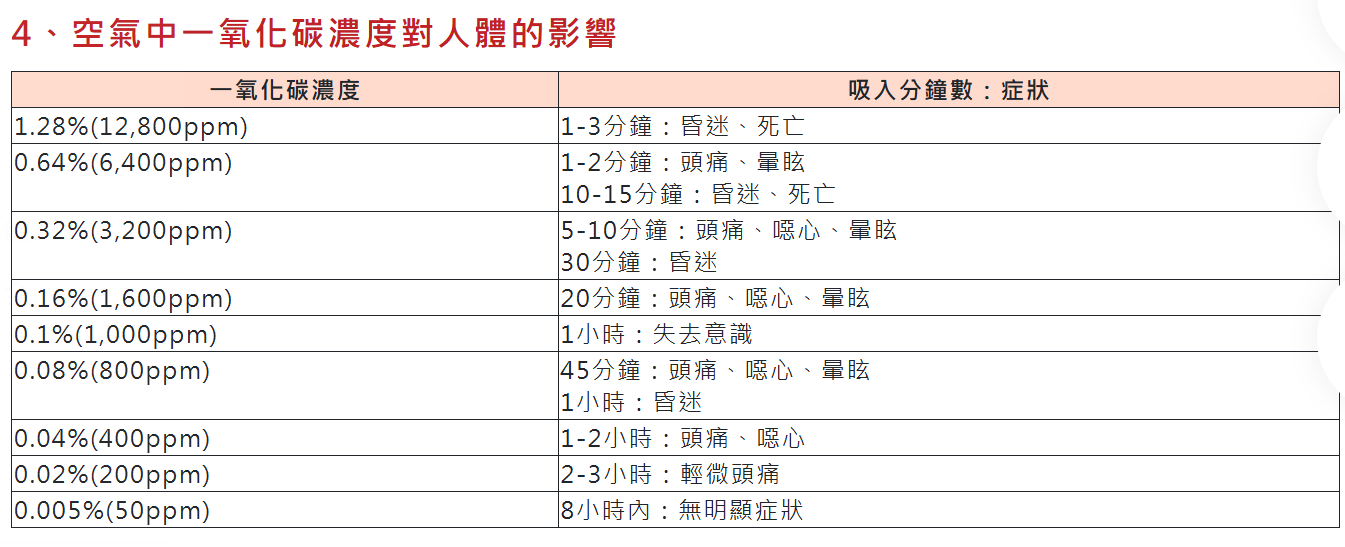 空氣中一氧化碳濃度對人體的影響一氧化碳吸入濃度對人體的影響。消防署提供
