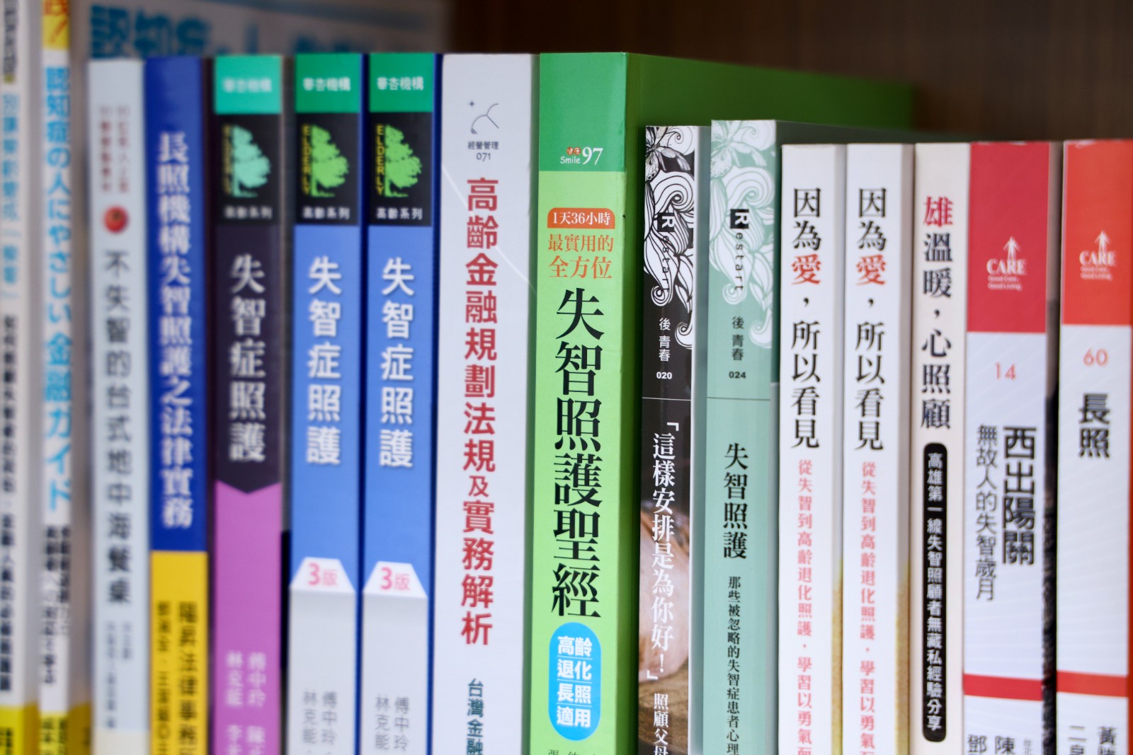 鄭嘉欣在書櫃裡放著許多失智症照護的書。李政龍攝