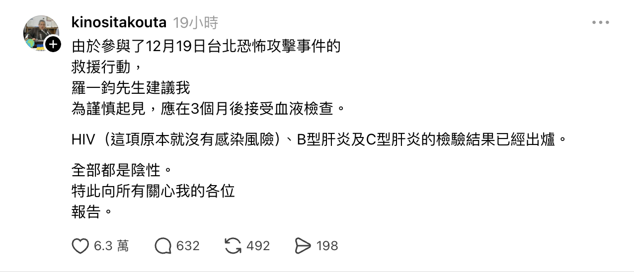 去年12月19日台北捷運中山站附近發生隨機砍人事件,當時在南西誠品一帶的日本前電視台社會線記者木下黃太,見一名騎士遭砍傷後立即上前協助,徒手按壓傷口協助止血。事後因傷者中有人為HIV感染者,引發外界關注是否存在血液暴露風險。木下黃太昨(21)日發文表示,經過3個月追蹤檢驗後,HIV、B型肝炎及C型肝炎結果均為陰性,向外界報平安。