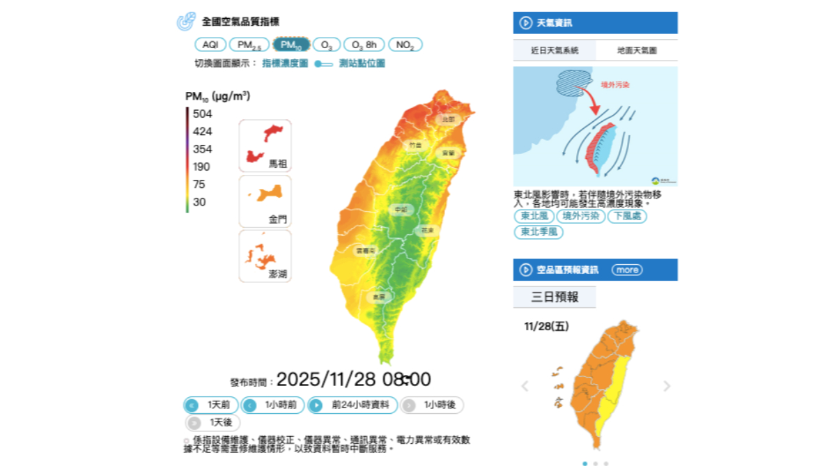 根據環境部空氣品質預報資訊顯示,今日(11/28)東北季風影響,東北風挾帶境外污染物影響台灣及離島,影響情況視上游濃度累積及降雨情況而有所變化。中南部位於下風處,污染物易累積。