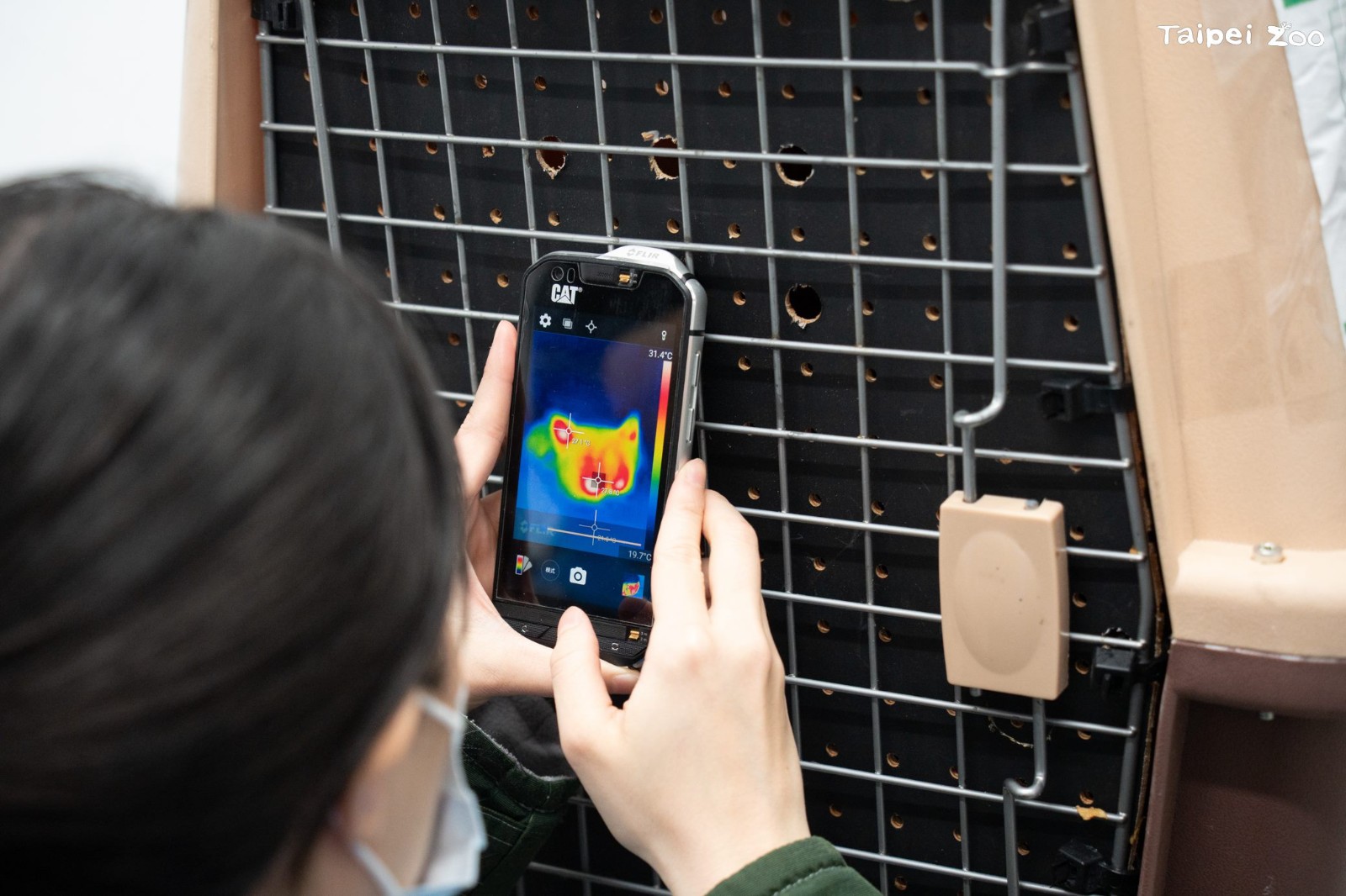 動物園員工從機場運送小貓熊「茜茜」入園,隨時留意狀態。台北市動物園提供