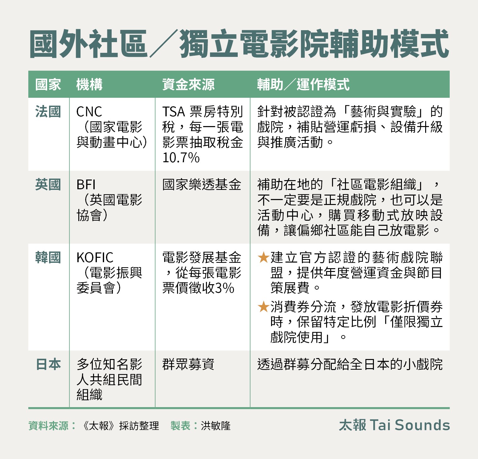 他山之石:法、韓、日如何保住獨立戲院法國被公認為全球保護電影文化最完善的國家,不同於我國電影院收的娛樂稅是地方稅,每一張電影票徵收「票價特別稅」,不會進入國庫的通用預算,而是直接進入法國國家電影中心的專戶,重新分配去補助那些放映小眾、藝術電影的獨立戲院,不僅提供社區戲院設備升級補貼,還包含戲院環境空間。此外,法國還有「電影調解員」制度,確保獨立戲院能第一時間拿到熱門電影拷貝,不被連鎖影城壟斷片源。