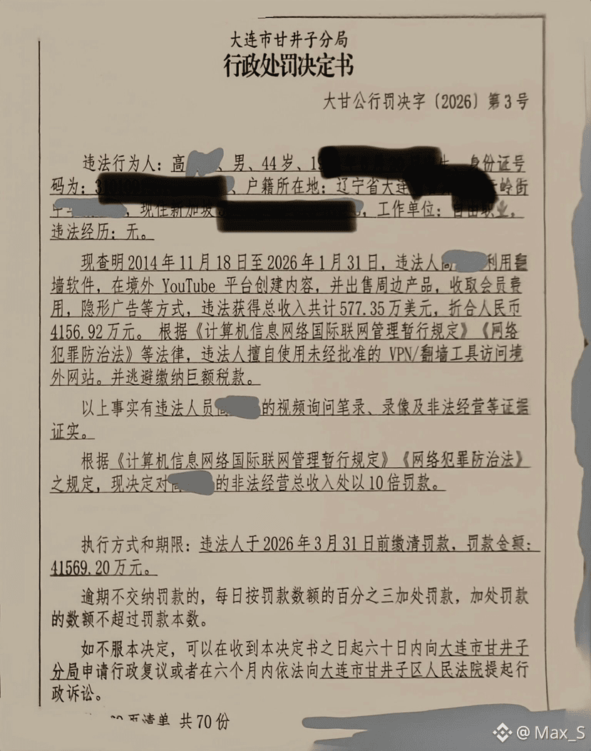 近日各大社群瘋傳一張「行政處罰決定書」截圖,老高自2014年起經營YouTube頻道,透過影片廣告分潤、會員制度、周邊商品銷售等方式,累計收入約577萬美元。老高因多年使用翻牆軟體製作影片並逃避繳納稅金,被大連警方處以10倍罰款。