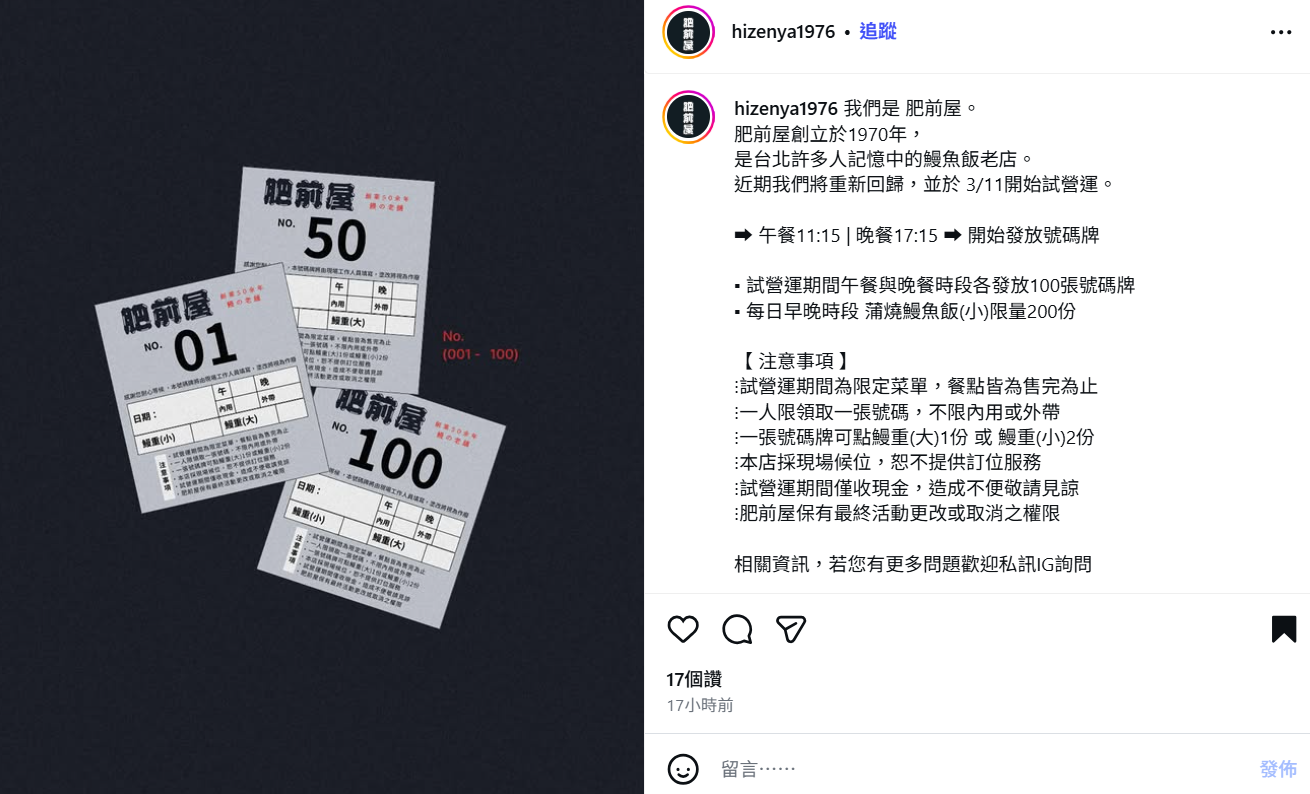 肥前屋業者也說明,試營運期間有新規則,午餐於11:15、晚餐於17:15開始發放號碼牌,各發100張,1人限領1張號碼牌,不限內用、外帶,現場候位、不提供定位、現金付款。