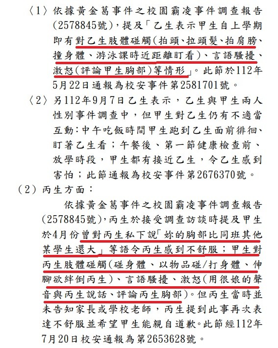 不過,女童和家長們主張,女童等人在2023年4月27日,確實有滴黃金葛汁液的行為,但男童並沒有因此健康受損,女童後續也沒有再犯。而且,男童於事後還自行跑到其中1位女童(丙女)的班級找丙女,可見沒有「心理健康受損」的問題。況且,本案事發原因,是男童長期騷擾女童,多次勸阻無效,女童才會反擊,主張男童自己對損害結果也有過失,請求法院降低精神慰撫金。監察院今(10/9)日公開調查報告,內容顯示女童自述遭男童長期性騷擾,成為本案爆發遠因。取自監察院