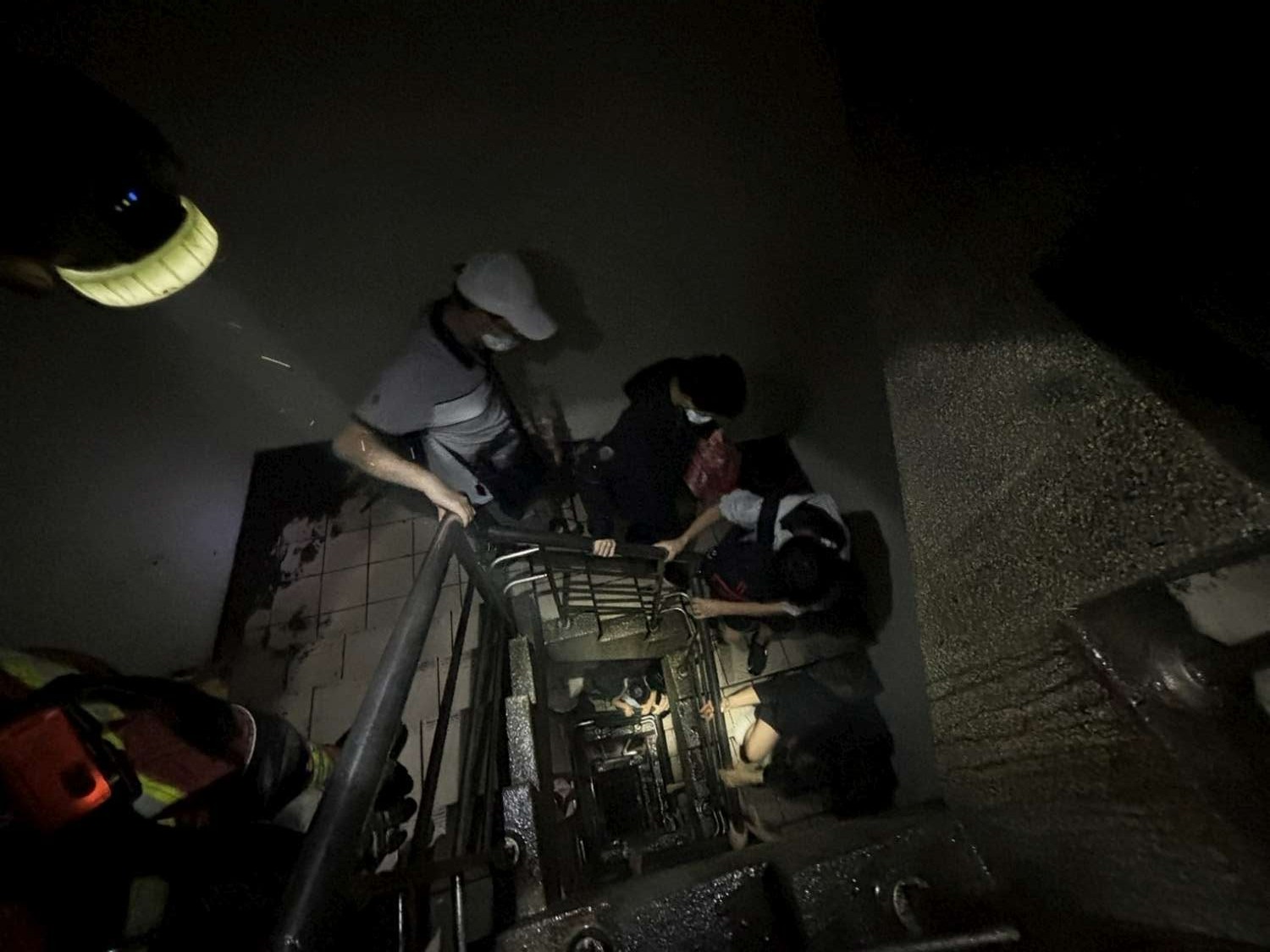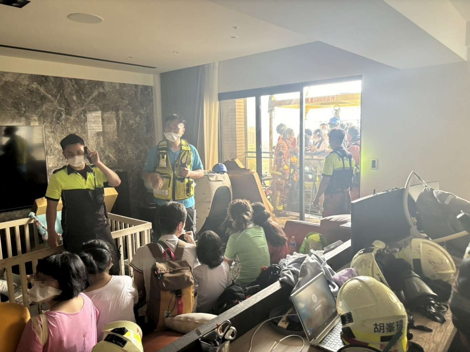 消防員登上晴空匯頂樓後氣量不足,無法下樓,受困到天亮。取自臉書「搶救消防員」