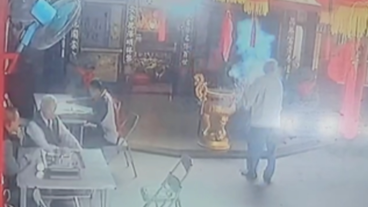 湯翁參拜後竟在天公爐前引燃爆裂物。翻攝監視器畫面