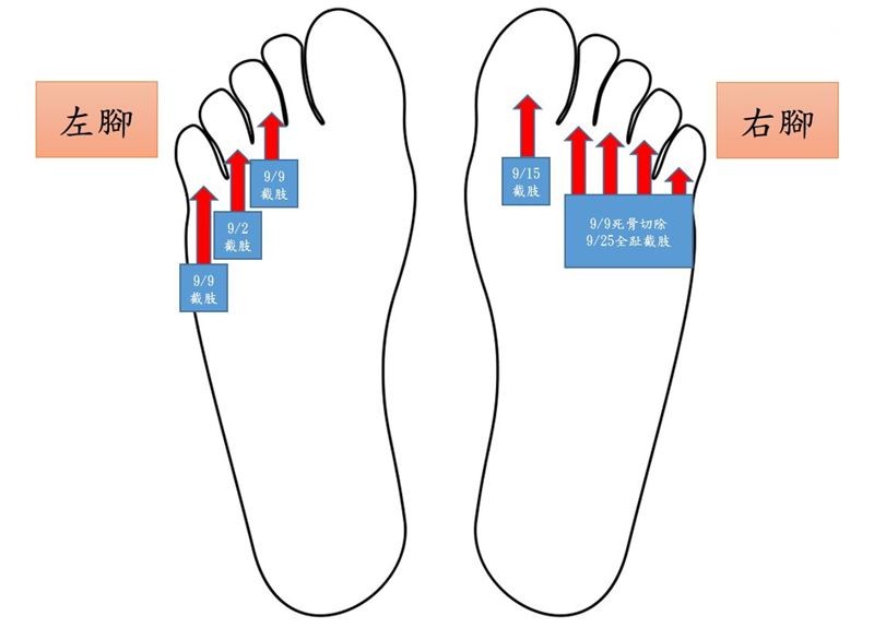 楊姓獸醫歷經3次截肢,最後右腳全趾都被截掉,左腳也有3趾截肢。白廷奕翻攝