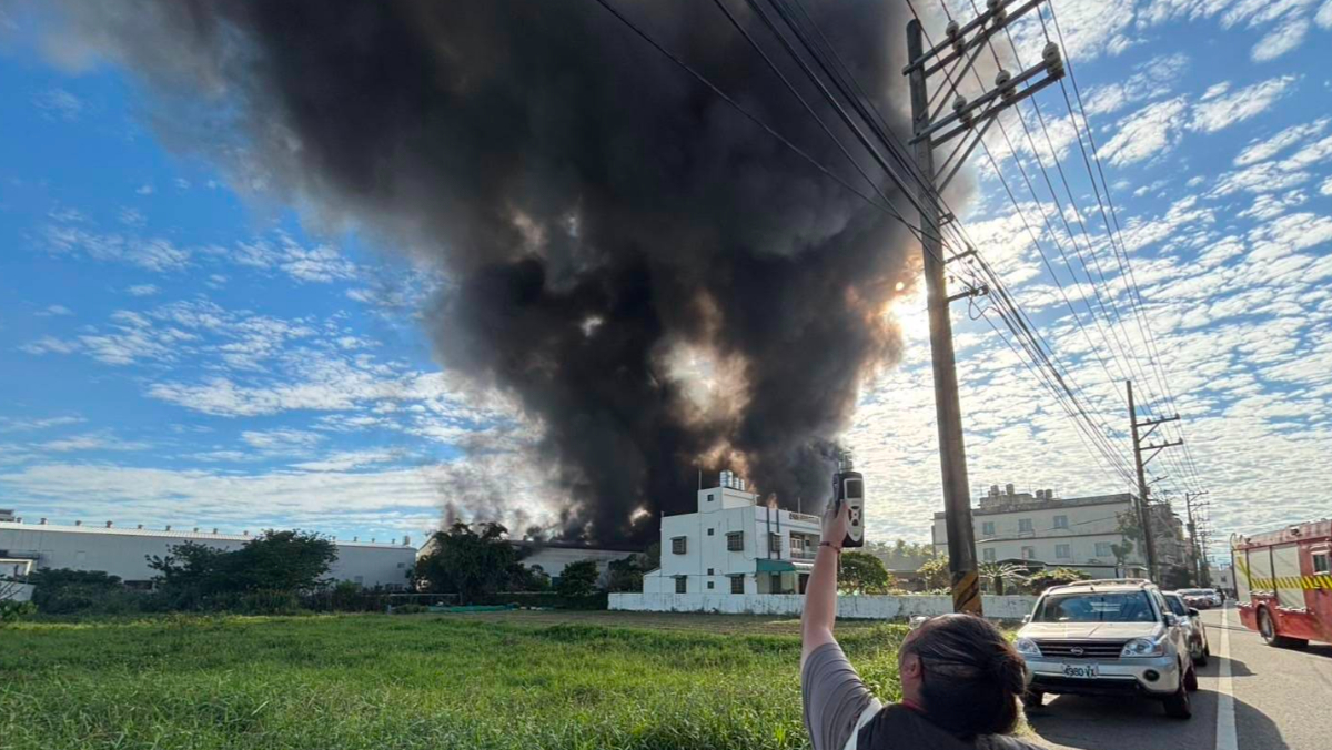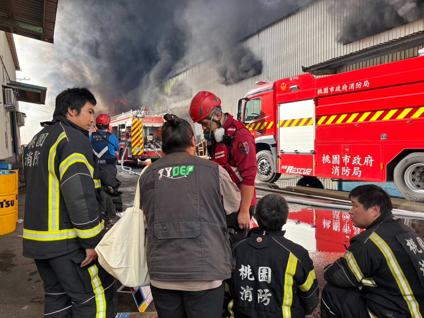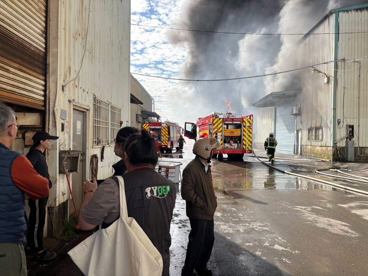 桃園蘆竹地下工廠大火釋放大量黑煙,環保局人員到場監控空氣品質與環境污染狀況。桃園市環保局提供