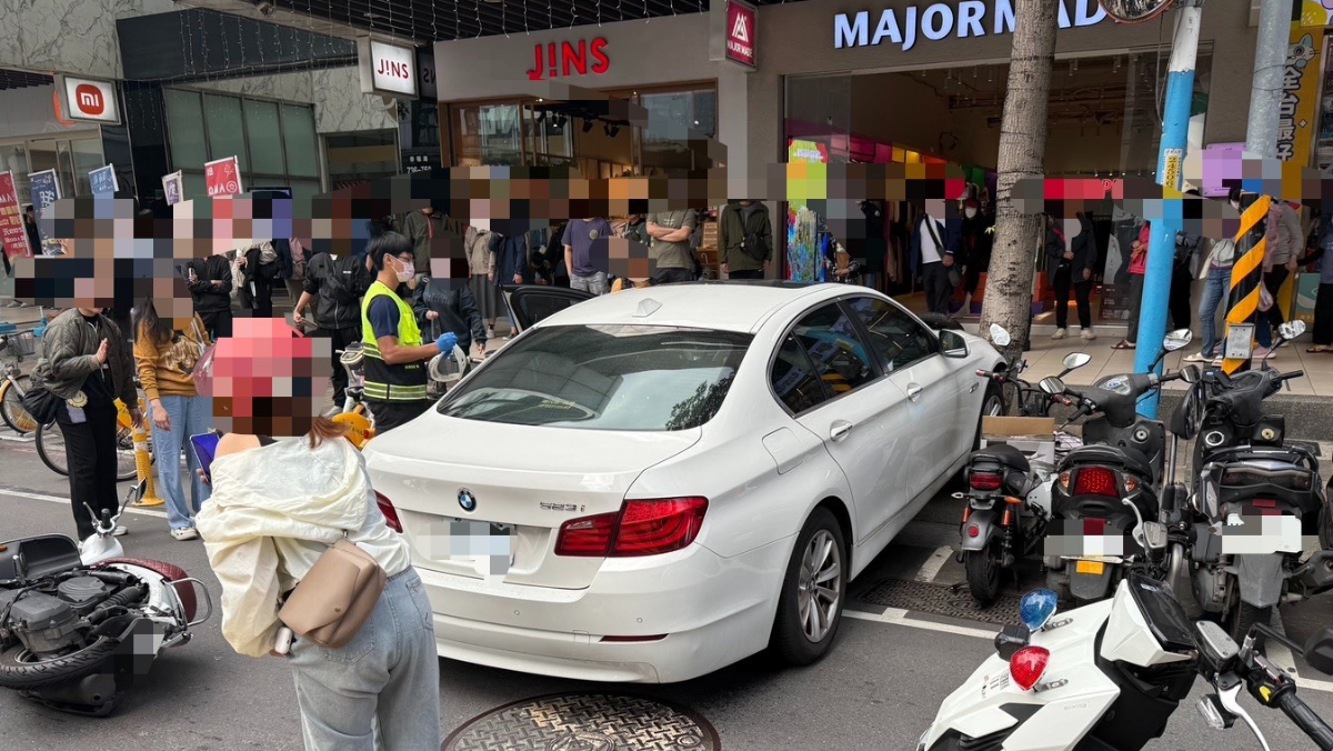 從監視器畫面可發現,BMW一路推撞女騎士,後來撞上1輛小客車,將女騎士和後座乘客夾在中間,之後一度停在路中,隨即又往前暴衝,並撞擊停放在路邊的1輛機車、2輛腳踏車,把逛街的人們嚇了一大跳,立即報警。