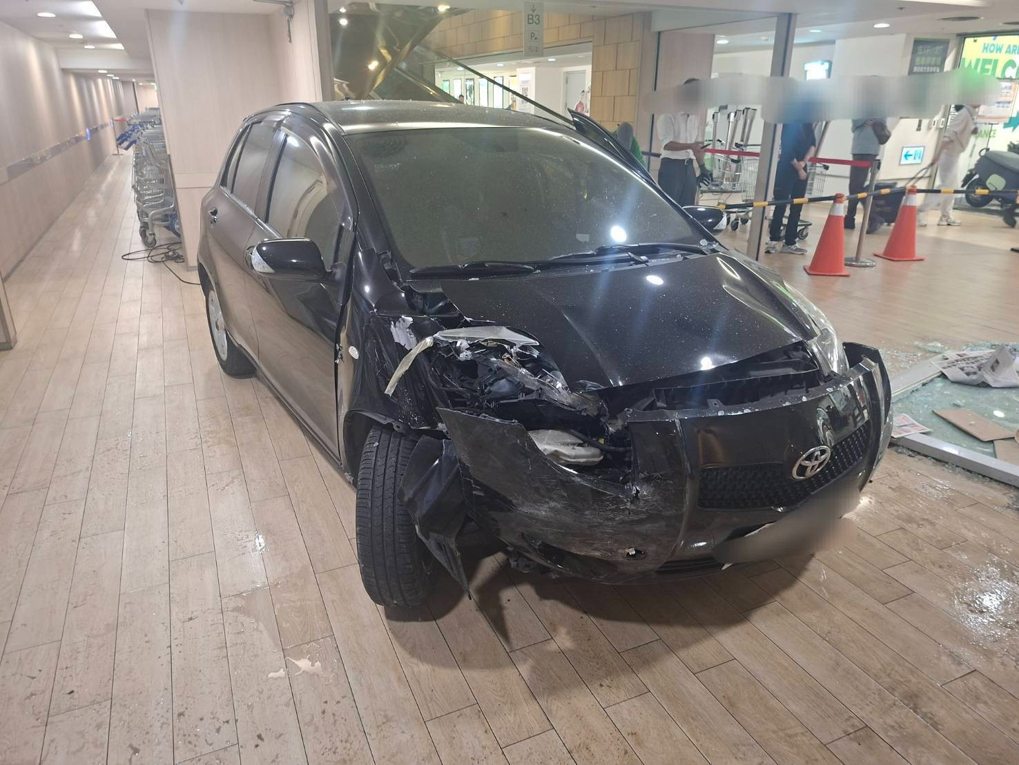 只見黑色轎車橫停在賣場入口處,車頭幾乎全毀,最慘的是無辜受害的賣場玻璃門,被撞到整片玻璃門噴飛,地上全是碎裂的玻璃。