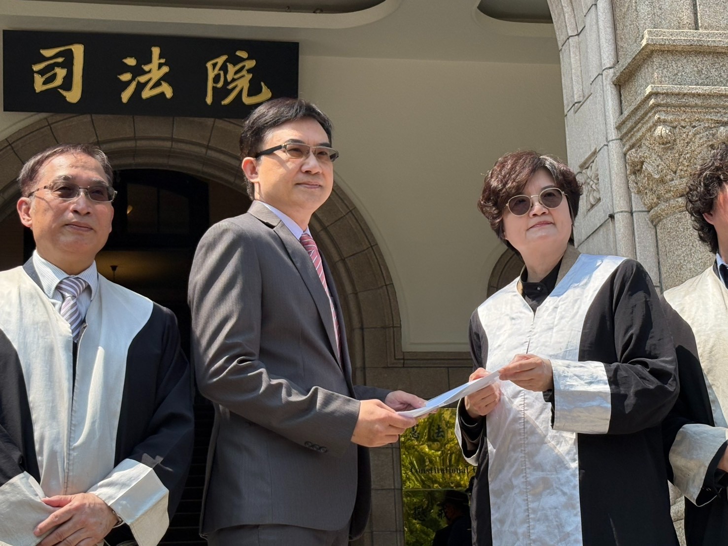 全律會理事長李玲玲將陳情書交給司法院新宣處處長暨發言人吳定亞。白廷奕攝