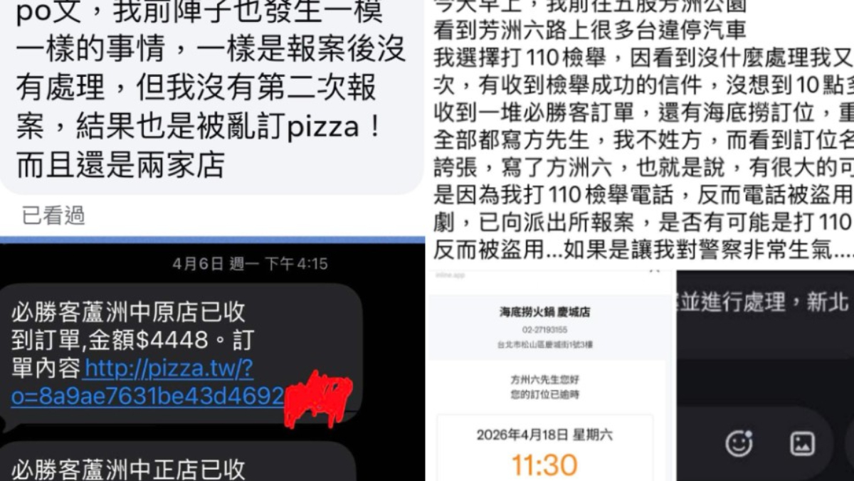 警方調查,新北一名何姓男子18日撥打110檢舉違規停車後,沒多久後就接連收到披薩與火鍋餐廳的訂餐、訂位通知,訂單姓名竟是「方洲六」,影射民眾檢舉地點「芳洲六路」。民眾於臉書社團發文後,發現不只他受害,另外也有蘆洲民眾也是具名檢舉,隨後也收到披薩店傳來的外帶訂單通知,才知道是連續針對性犯案。