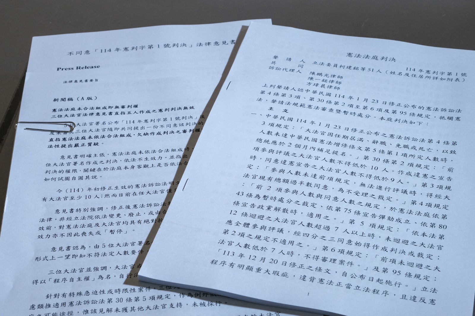蔡宗珍、楊惠欽、朱富美3名大法官兩度提出法律意見書(左),抗衡5位大法官的新聞稿版本(右)。資料照。廖瑞祥攝