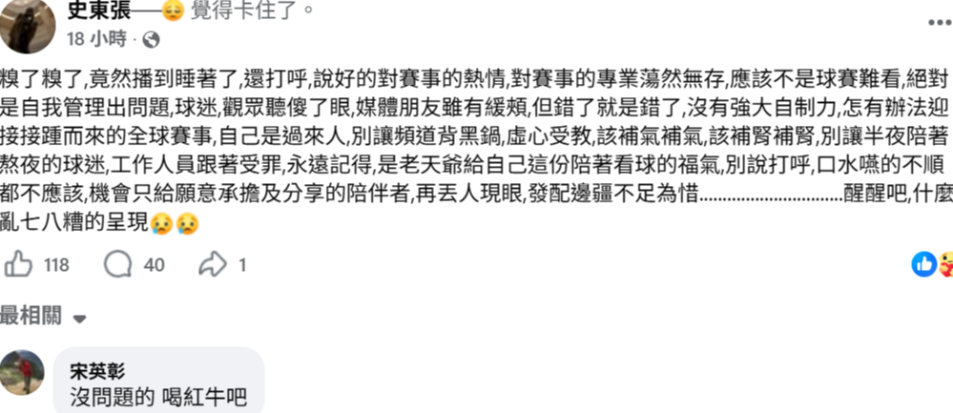 主播,累了!華視主播王韻筑在廣告時間打哈欠模樣大放送,為此發出道歉聲明,無獨有偶,觀眾發現博斯網球台轉播蒙地卡羅大師賽,傳來陣陣沉重打呼聲,球迷質疑主播是否「播到睡著了」。對此,該場比賽的主播張致平在社群中承認並致歉。