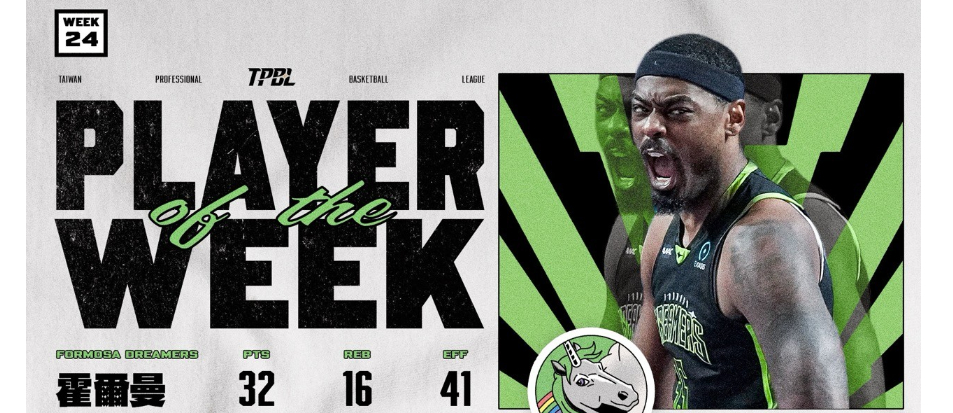 TPBL第二十四週單週最有價值球員(MVP)由霍爾曼拿下。福爾摩沙夢想家上週日作客新竹御嵿攻城獅主場,在一度落後多達27分的情況下上演驚天逆轉,不僅寫下聯盟史上最大逆轉勝紀錄,也終結長達兩年四個月未能在新竹縣體育館取勝的紀錄,霍爾曼則以宰制級表現榮膺本週MVP。