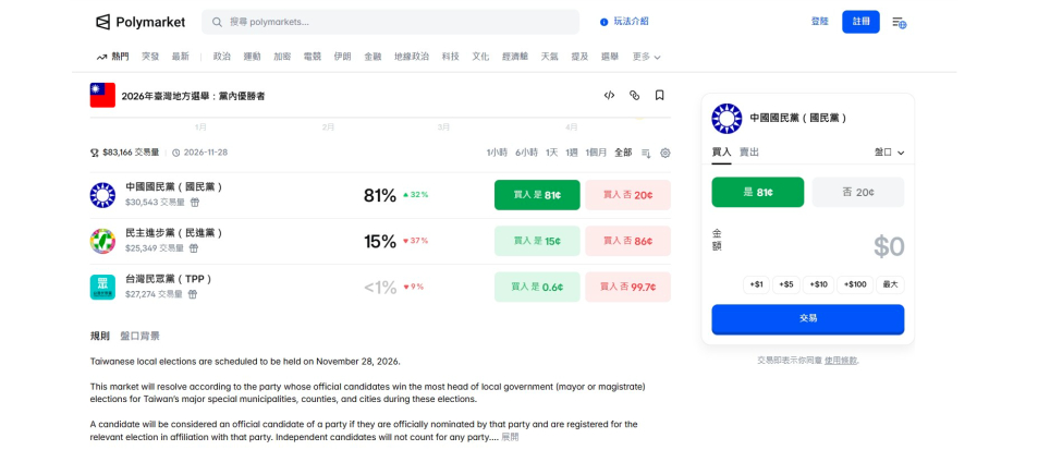 今年底將舉辦九合一選舉,有不法分子利用境外去中心化預測平台「Polymarket」,以2026年台灣地方選舉為賭博標的,吸引不特定民眾以虛擬貨幣進行選舉結果投注,對我國選舉公正性與廉潔性構成嚴重威脅,桃園地檢隨即組成專案小組,將1名涉案的廖姓男子拘提到案,訊後諭知2萬元交保。