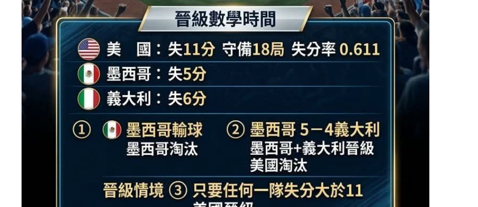 WBC(World Baseball Classic,世界棒球經典賽)B組賽程將在台灣時間進行義大利與墨西哥之戰,由於美國隊爆冷輸球,使得B組形成3搶2局面,狀況類似C組的台灣、澳洲與南韓搶晉級,可能出現比失分率狀況,由於數學算式難懂,負責轉播的電視台提前製作解答圖卡,幫助球迷快速瞭解戰局變化。