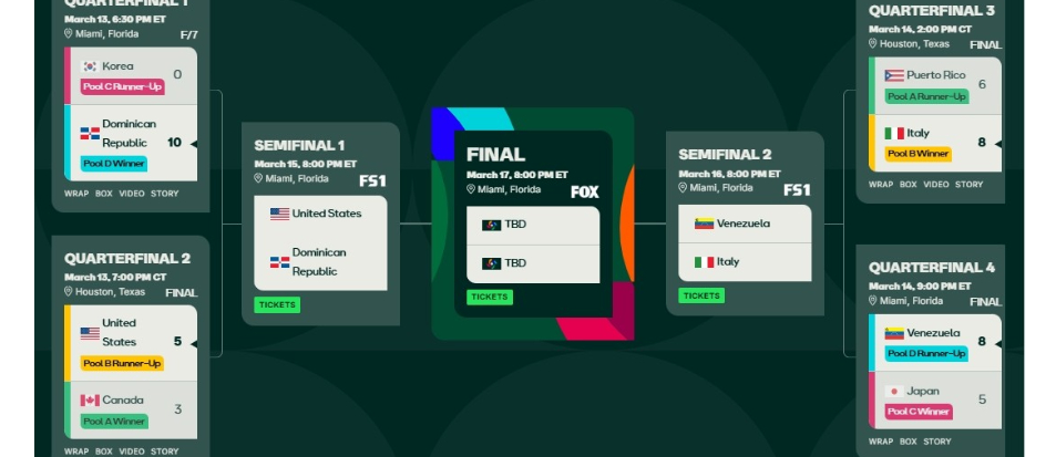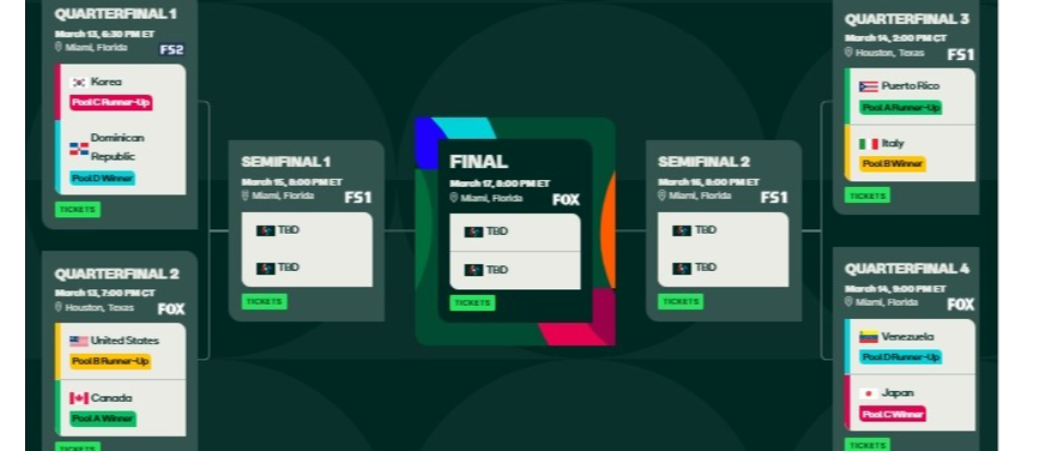 WBC(World Baseball Classic,世界棒球經典賽)經典賽進入8強淘汰賽,台灣時間明天上午正式展開賽程,其中加拿大對美國、波多黎各對義大利、日本對委內瑞拉、多明尼加對韓國。
