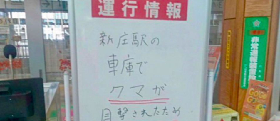 據日本媒體今天(11/8)報導,今天在日本山形縣的JR新庄站,出現一隻熊,新幹線一度停駛,所幸站務員反應快,將熊反鎖在車庫內,獵人也協助捕獲,才沒有釀成傷亡。