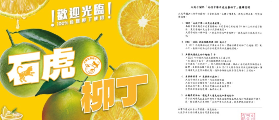 手搖飲品牌大苑子近期主打「鮮榨柳丁綠」全面改用石虎柳丁,合作拍攝宣傳影片的南投中竂長壽天然農場卻稱「一顆沒買」,引發爭議。對此,大苑子今(11/19)傍晚發聲明,從未宣稱使用「石虎友善農作」標章,強調訴求不在標章,而在理念倡議,即是支持南投中寮的柳丁,就是支持石虎友善的棲地。