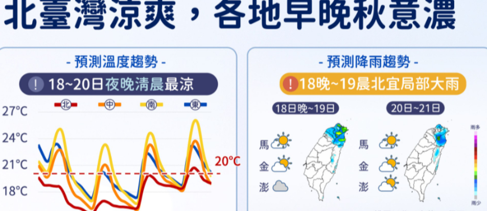 東北季風影響,降溫明顯,北台灣的民眾幾乎都穿上厚重外套,不過強度也持續減弱中,中央氣象署預報員賴欣國表示,今晚至明天清晨這波冷空氣較強,西半部、宜蘭清晨低溫僅15、16度,但白天高溫就會回升至22度,因此明天(11/20)清晨外出,仍要注意保暖措施。另外,這周末雖然天氣回穩,但下一波東北季風將從下週一(11/24)開始影響台灣,恐再感受明顯降溫5天。